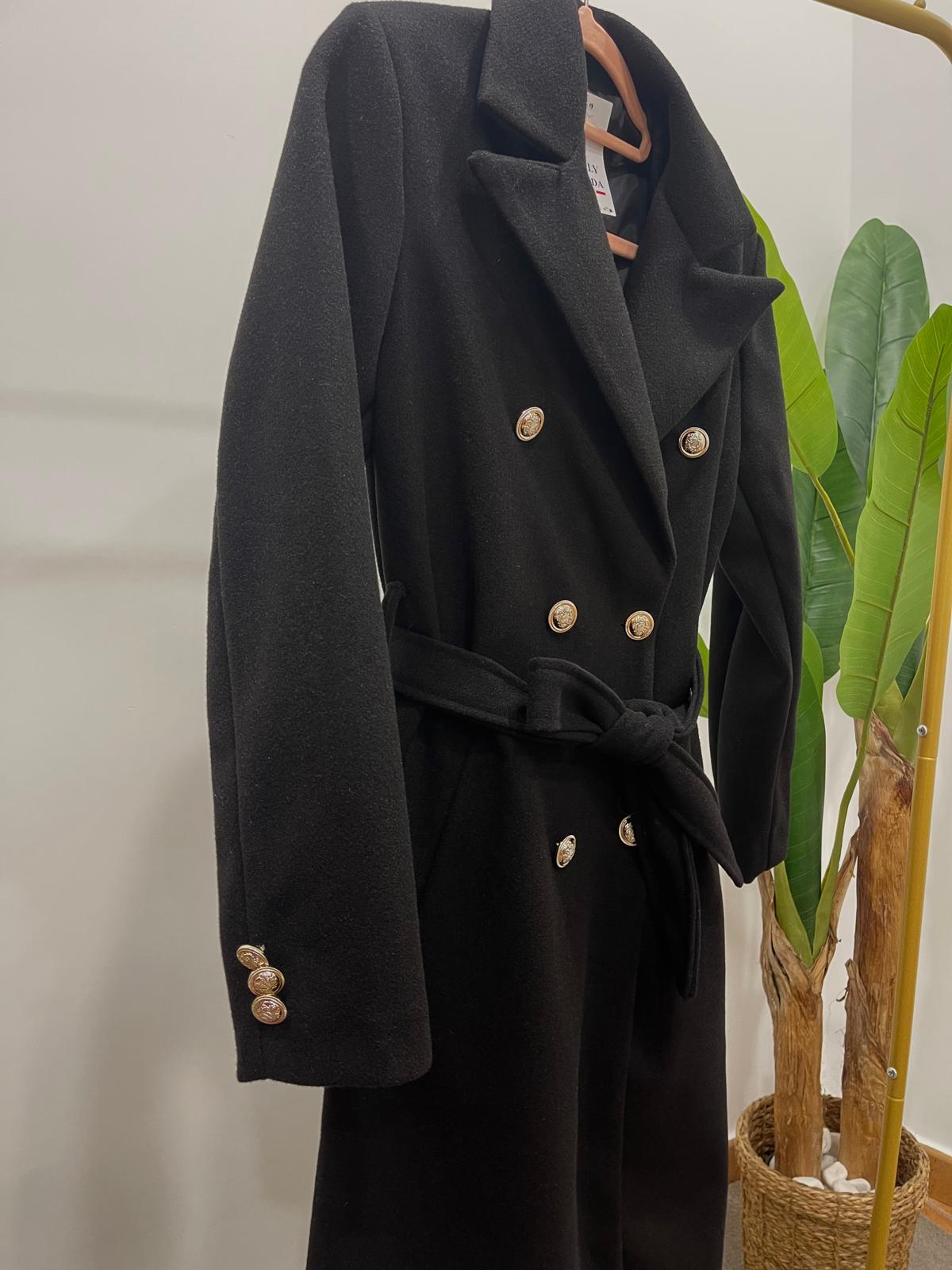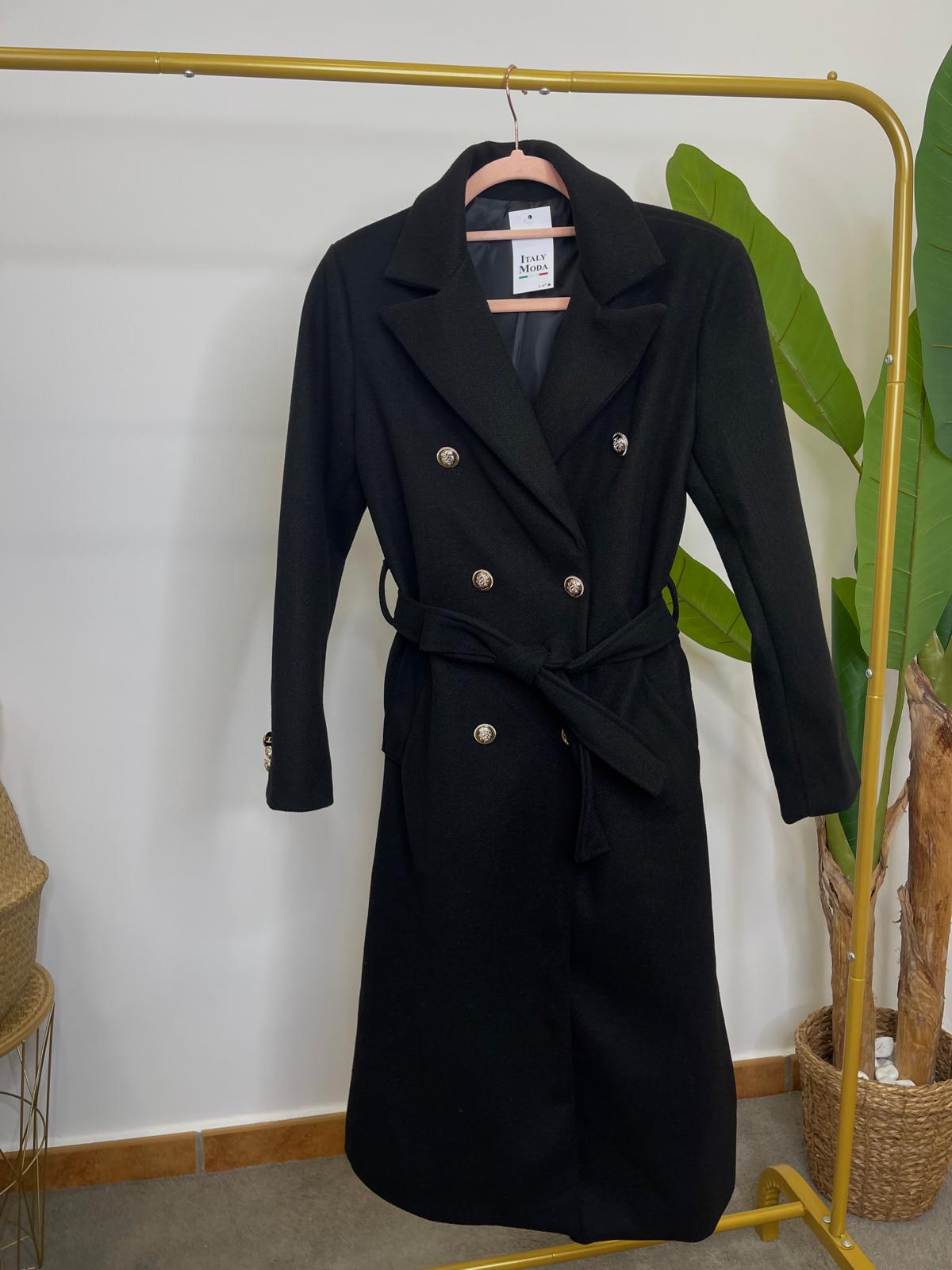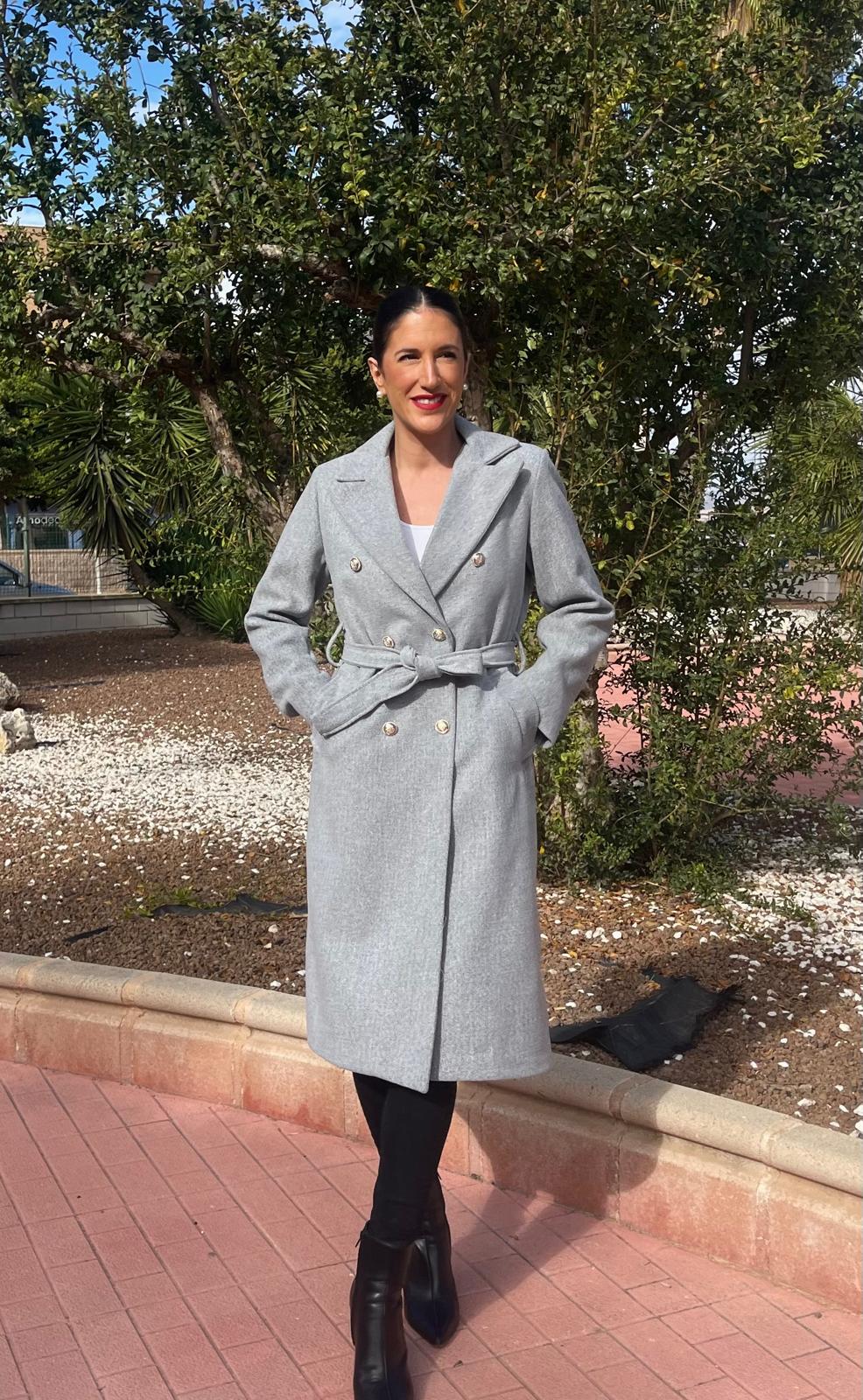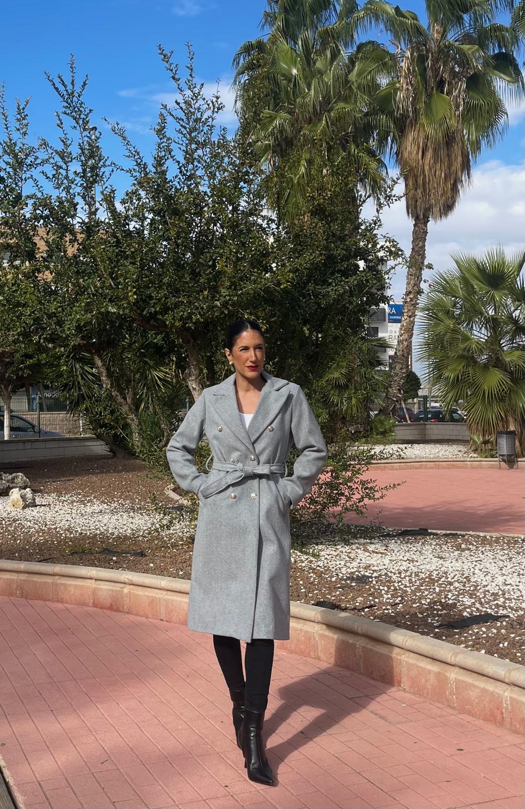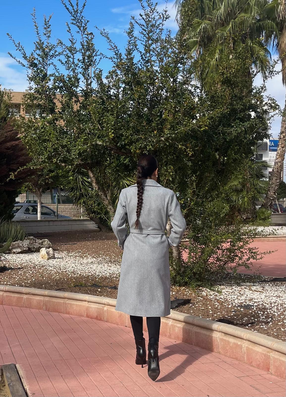 Abrigo con cuello solapa y manga larga. Bolsillos laterales. Cierre frontal cruzado con botones metálicos y cinturón del mismo tejido.