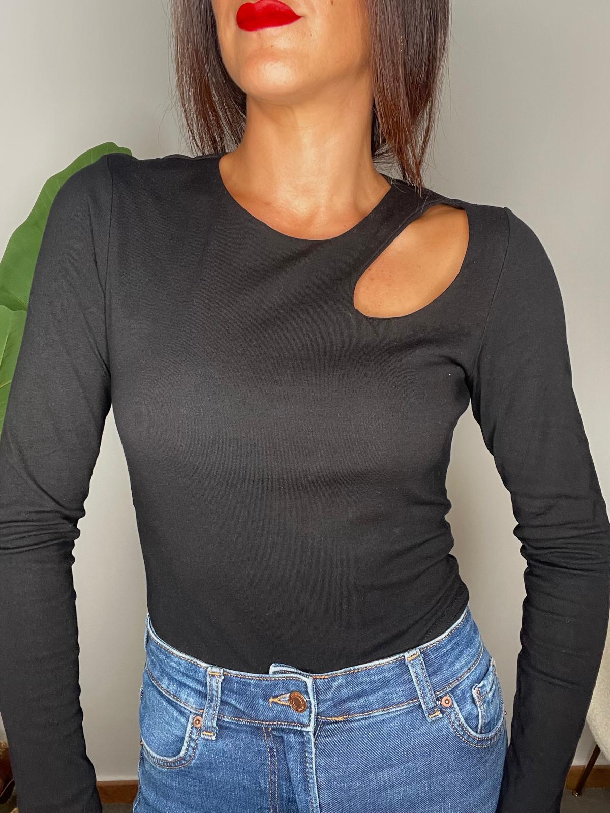 Body de cuello redondo y manga larga. Detalle de abertura en un lado de la parte frontal. Cierre en bajo con botones a presión. Tejido elástico.