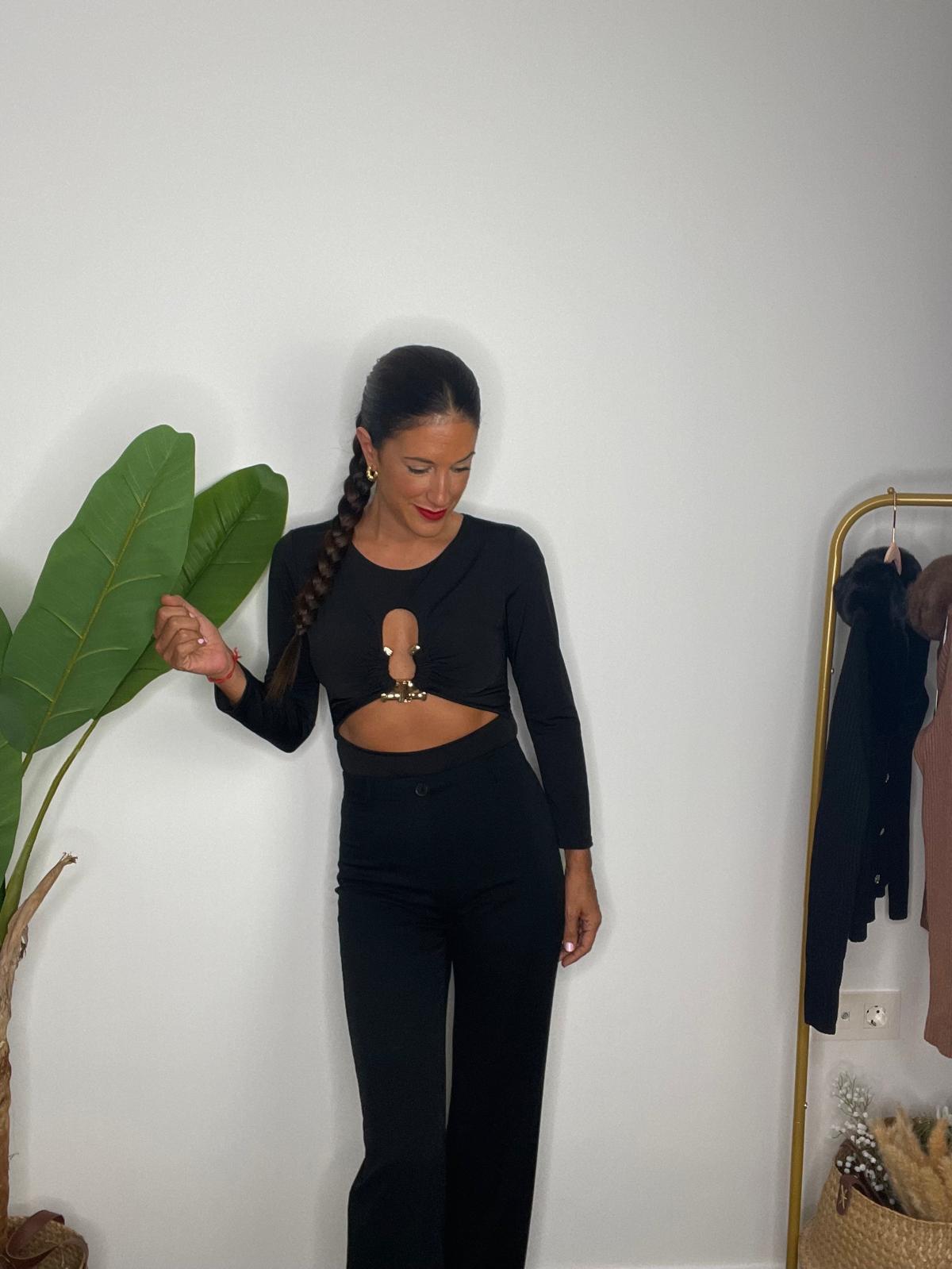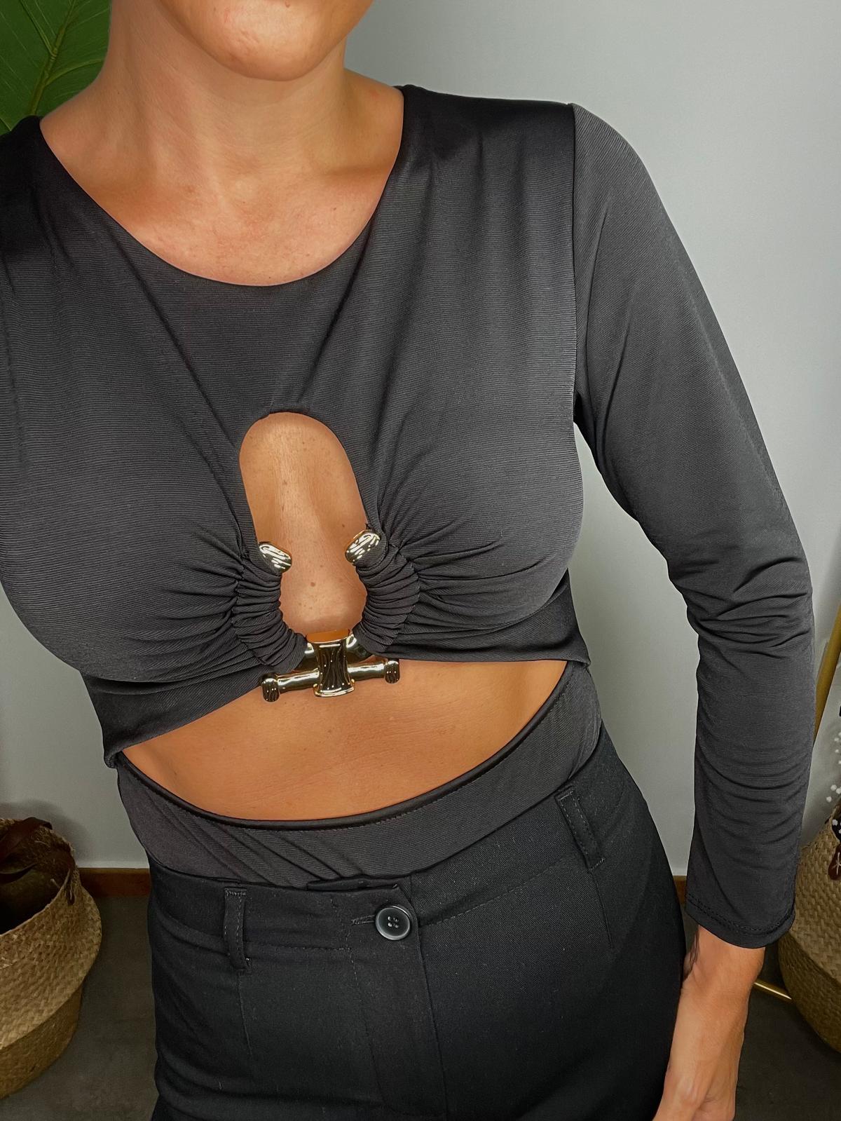 Body de cuello redondo y manga larga. Detalle de hebilla dorada metálica en el escote. Copas incorporadas en el pecho. Abertura en la parte delantera. Cierre en bajo con ganchos.
