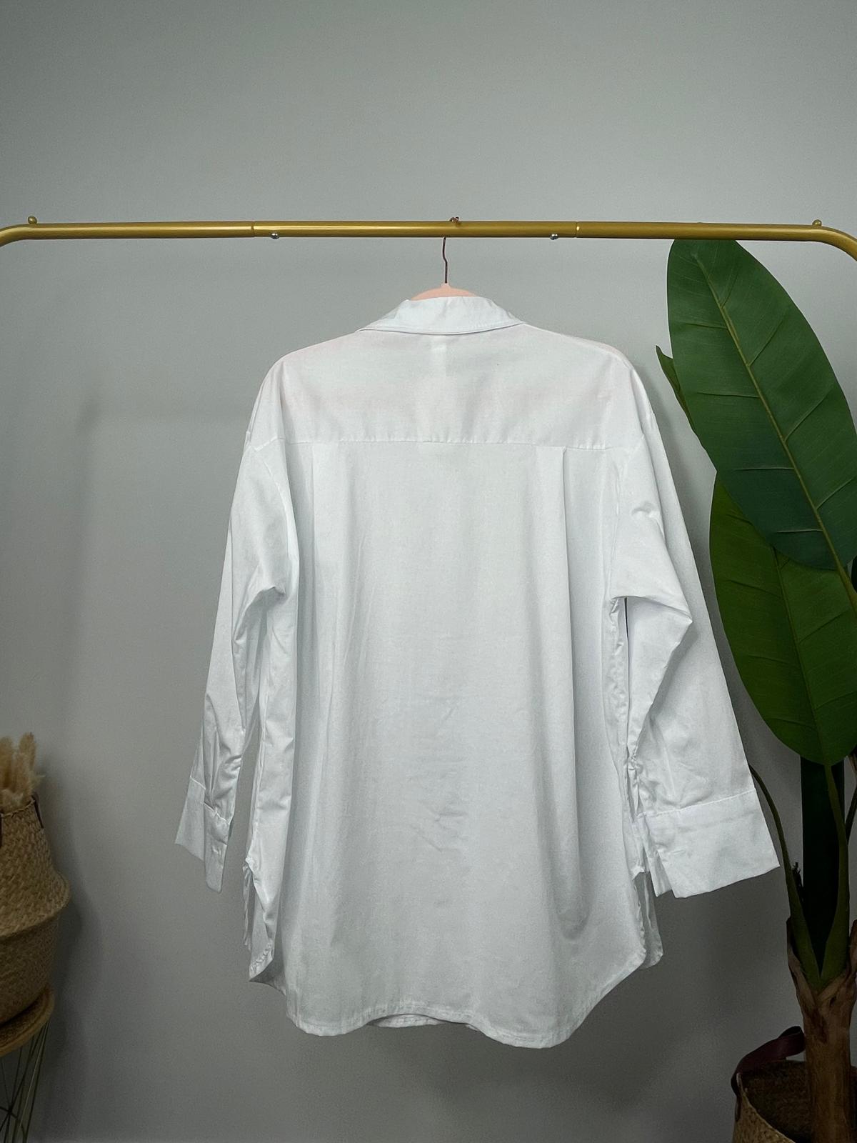 Camisa oversize de cuello solapa. Manga larga con hombro caído acabado en puño. Detalle de pinzas en espalda. Cierre frontal con botones.