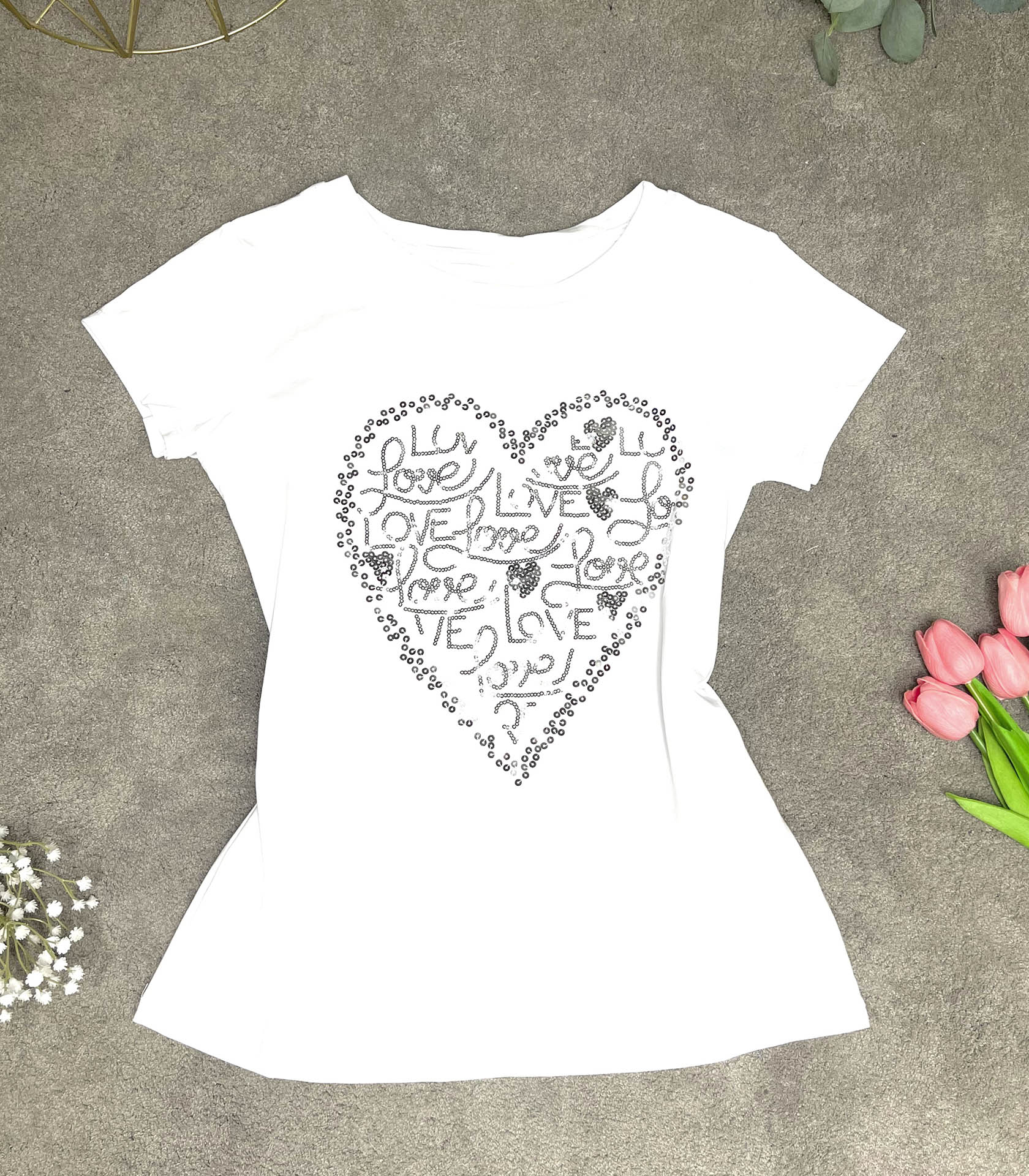 Camiseta de cuello redondo y manga corta. Detalle de corazón delantero con aplicación de lentejuelas.