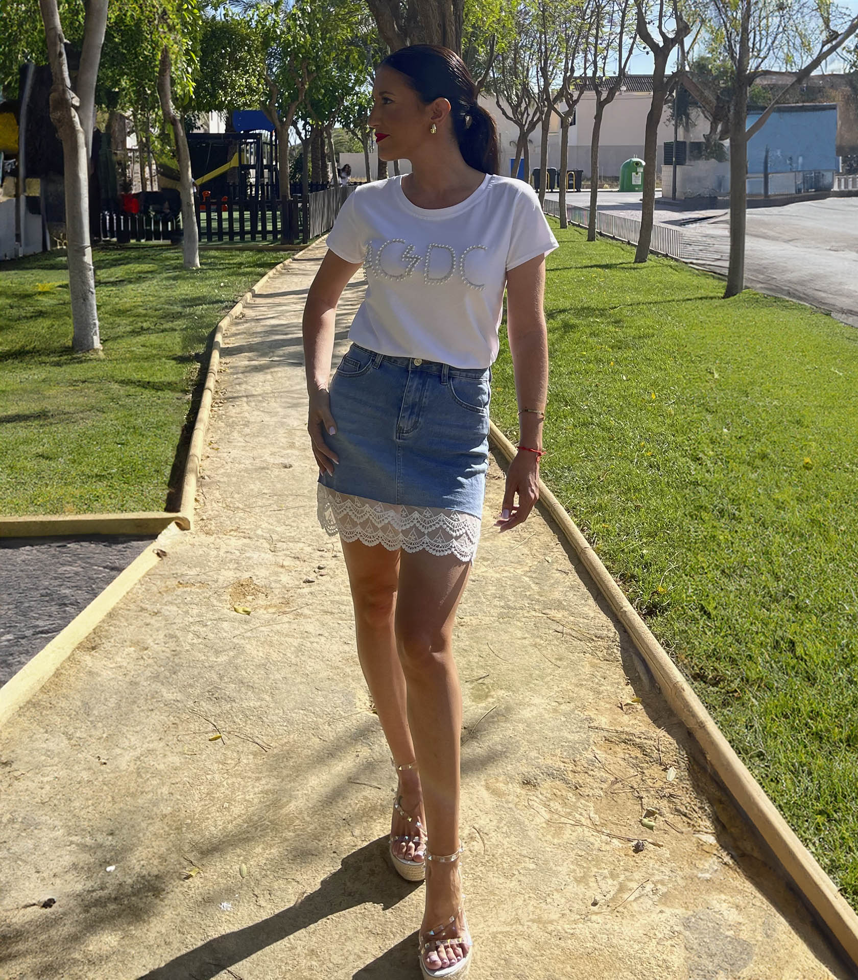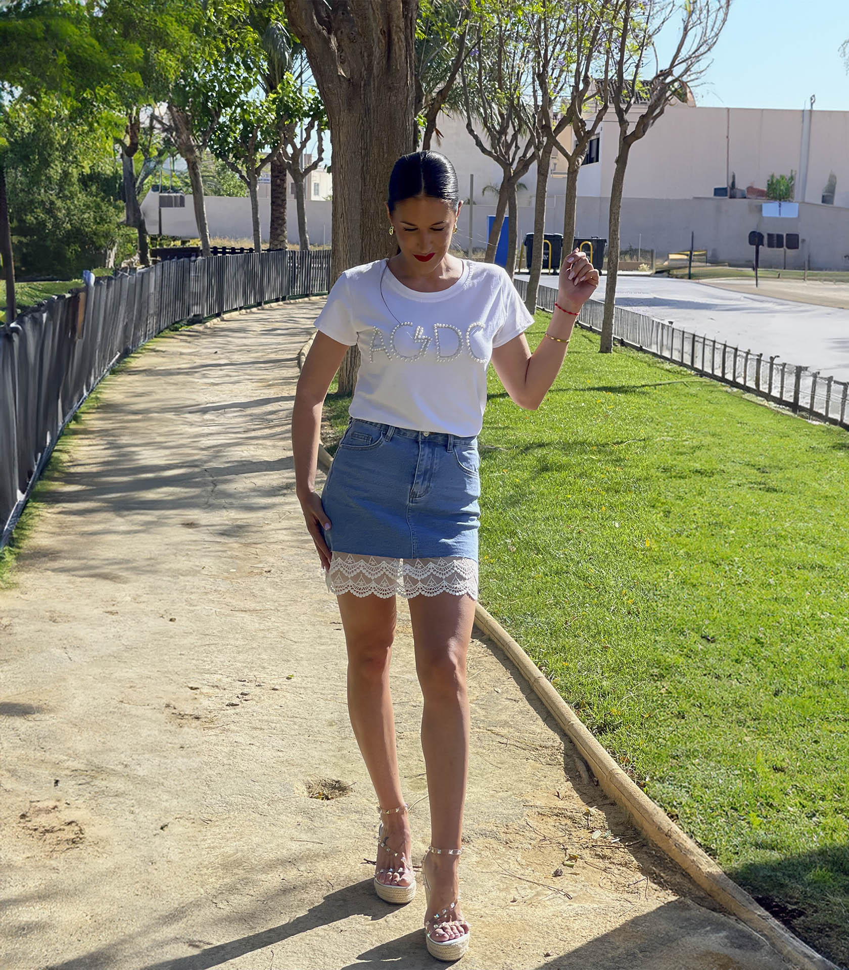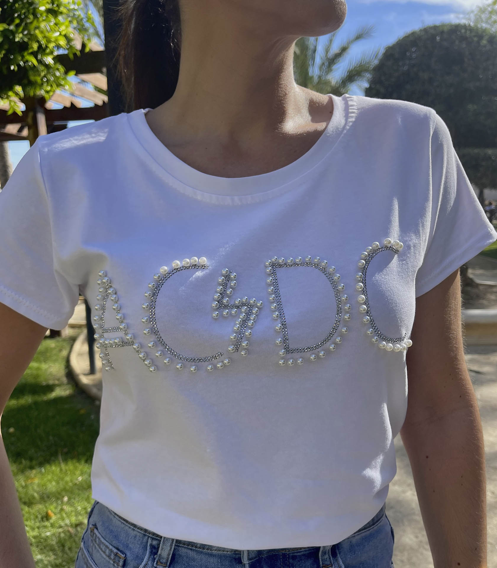 Camiseta manga corta con detalle de perlas cosidas en la parte frontal y detalles en plata. Cuello redondo.