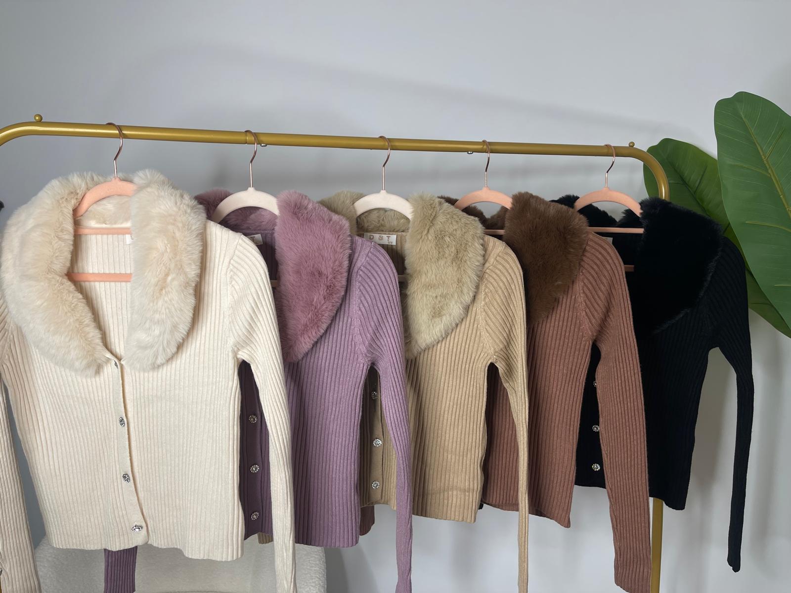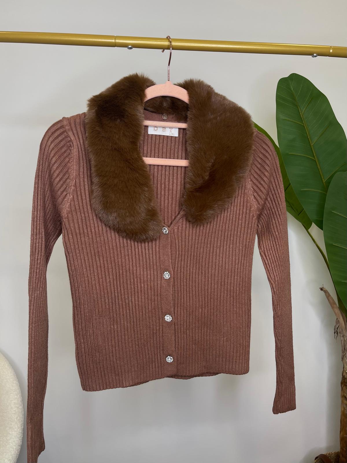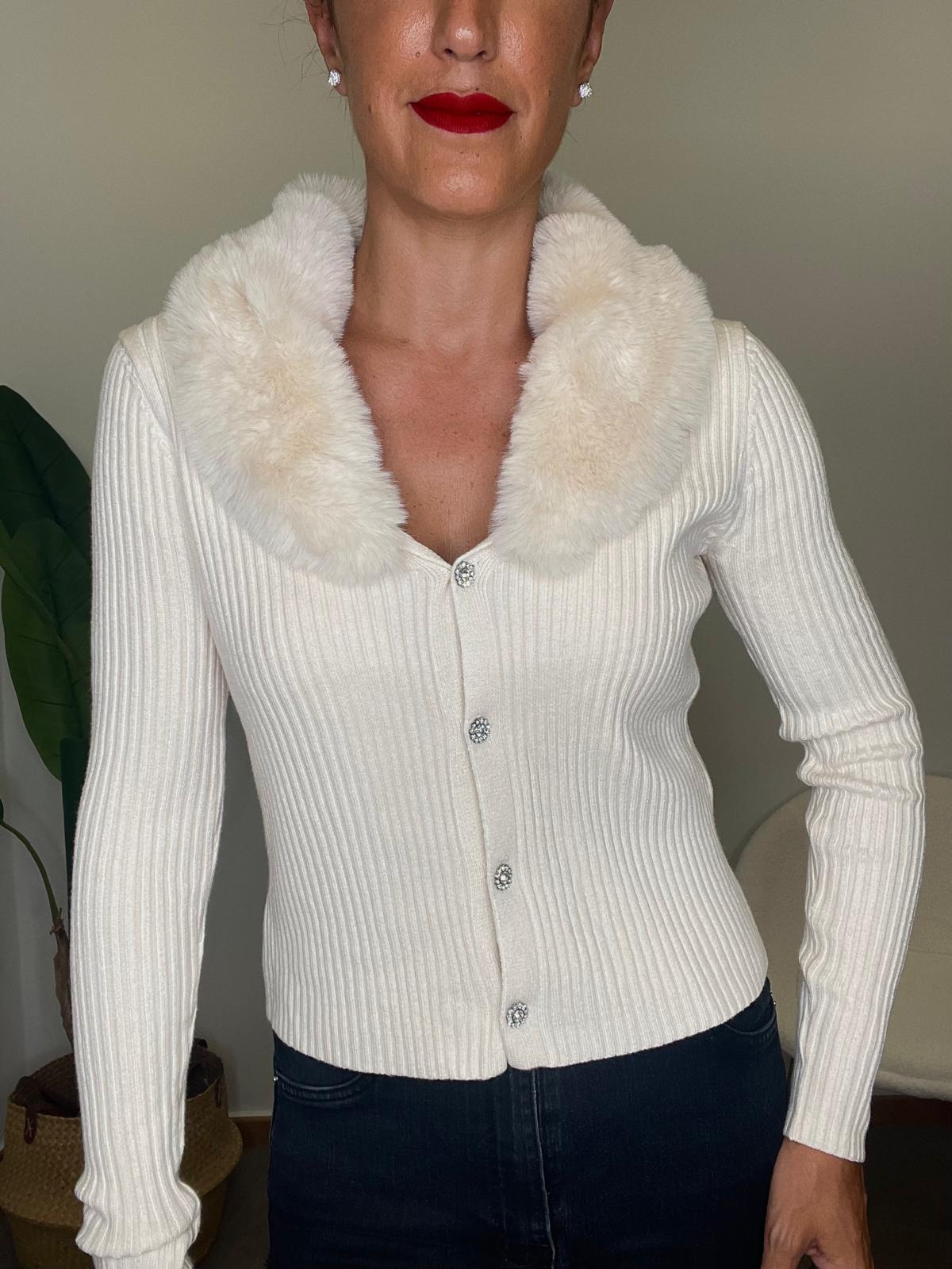 Chaqueta de punto con cuello en pico y manga larga. Complemento de pelo en el cuello enganchado con botones. Detalle de botones con brillos en la parte delantera. Cierre frontal con botones.