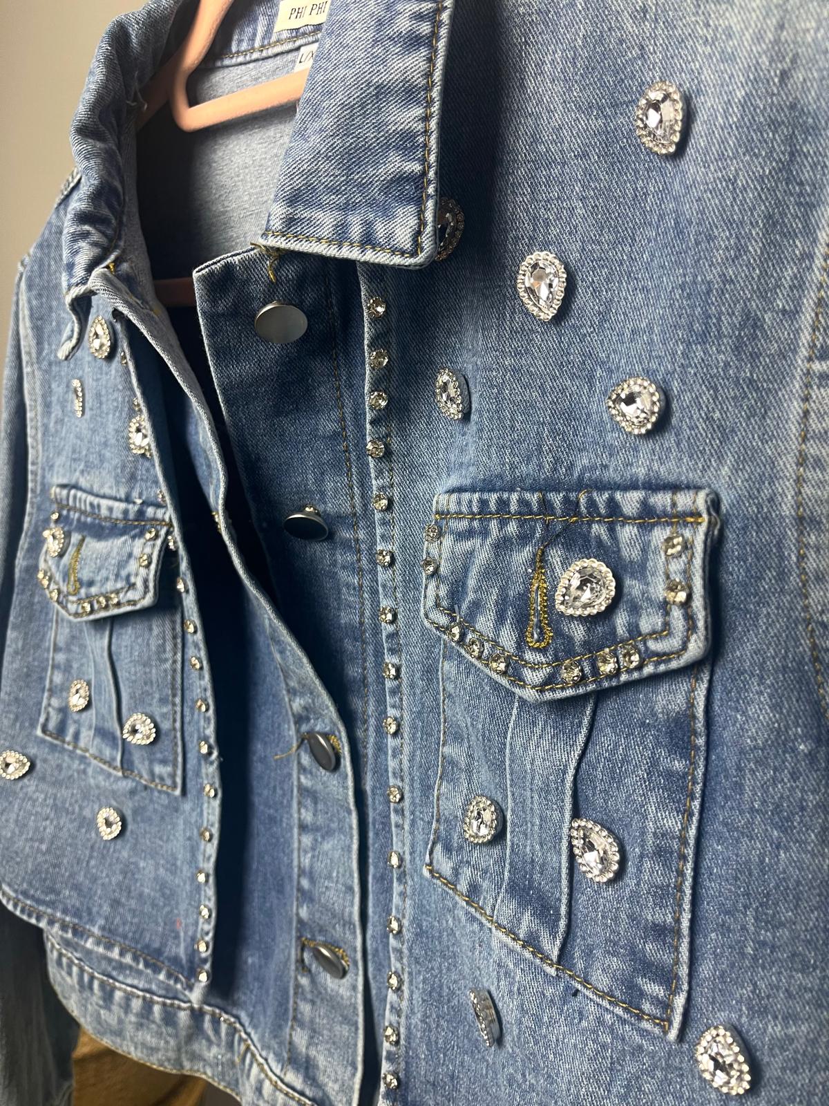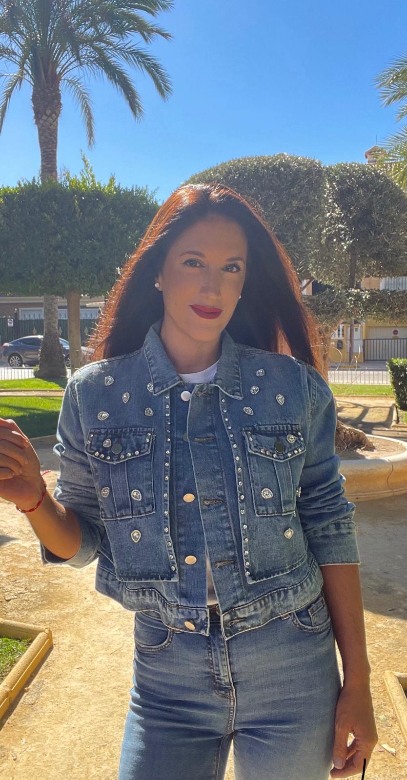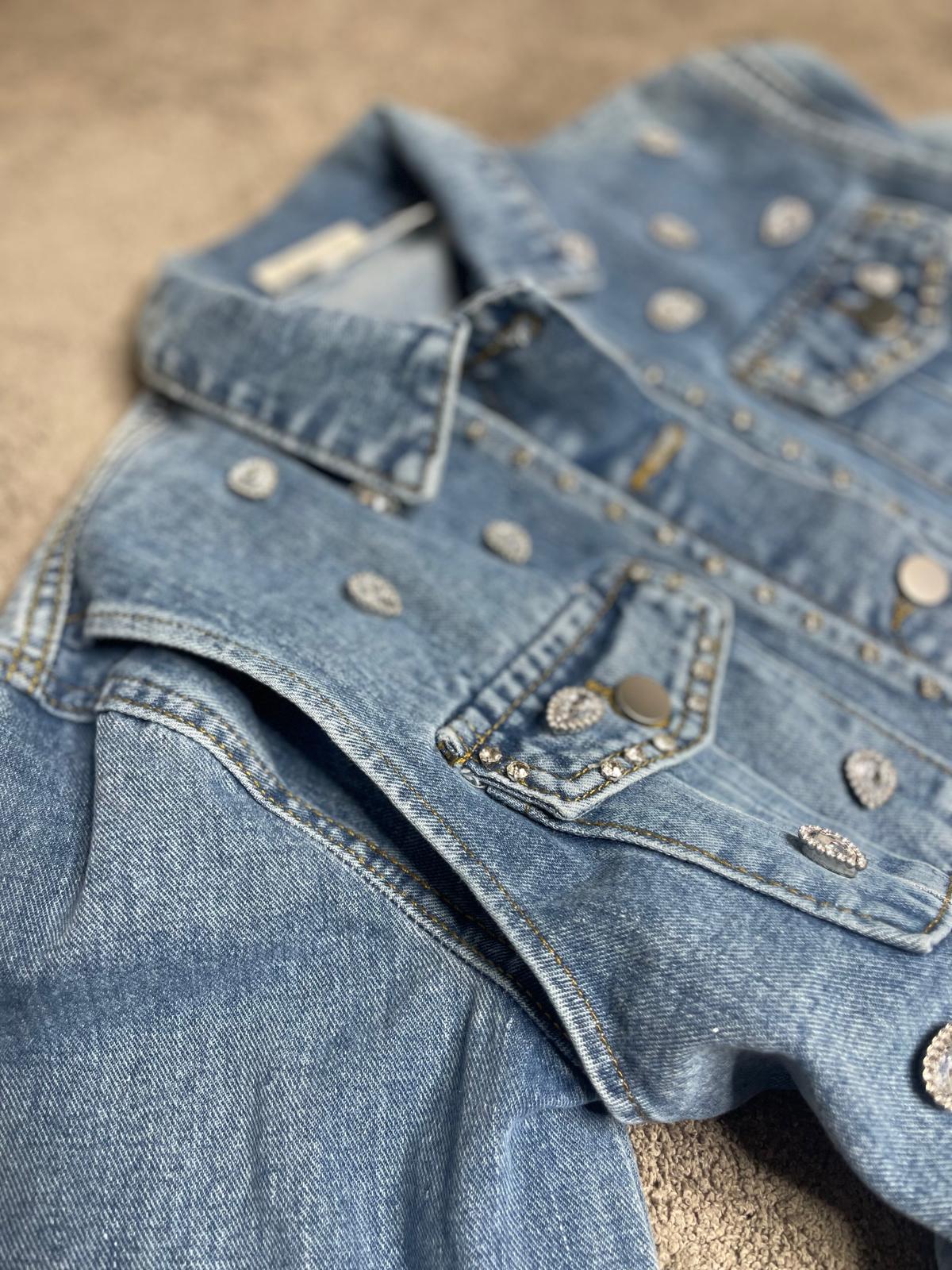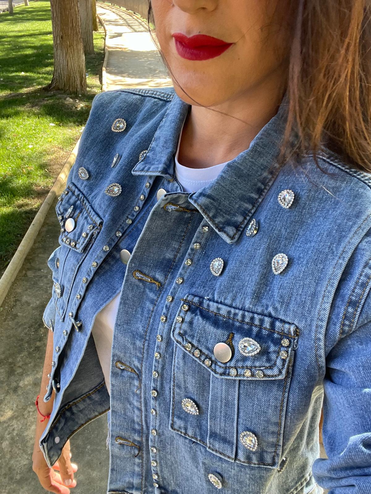 Chaqueta de cuello solapa y manga larga. Detalle de aplicación de joyas en la parte delantera. Bolsillos de plastrón en pecho. Parte frontal con doble tejido efecto chaleco. Bajo con trabillas. Cierre frontal con botones metálicos.