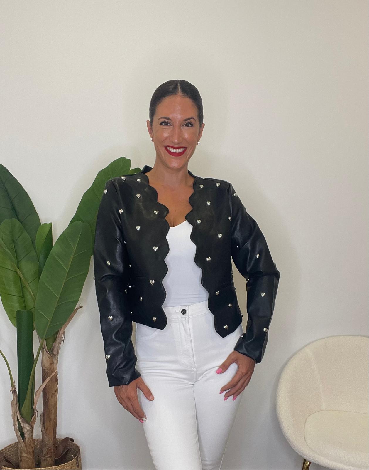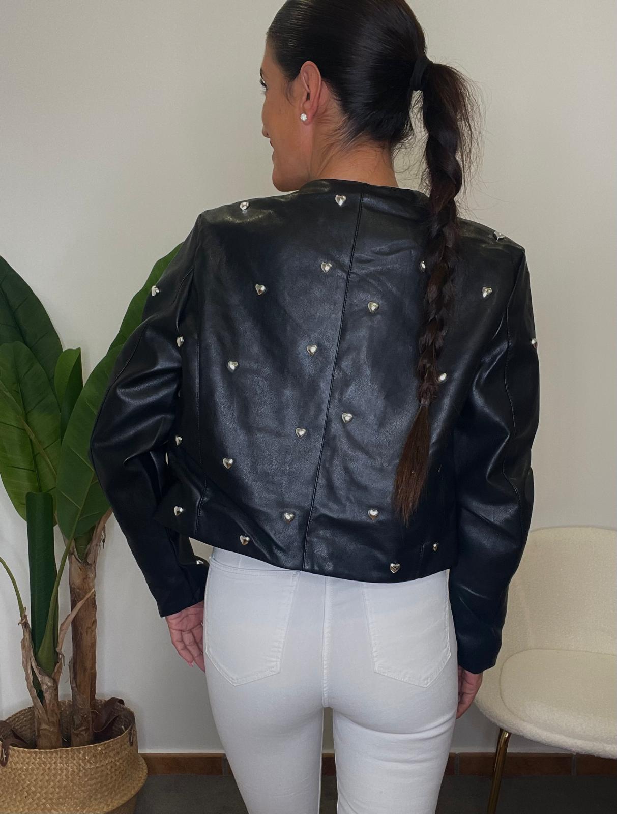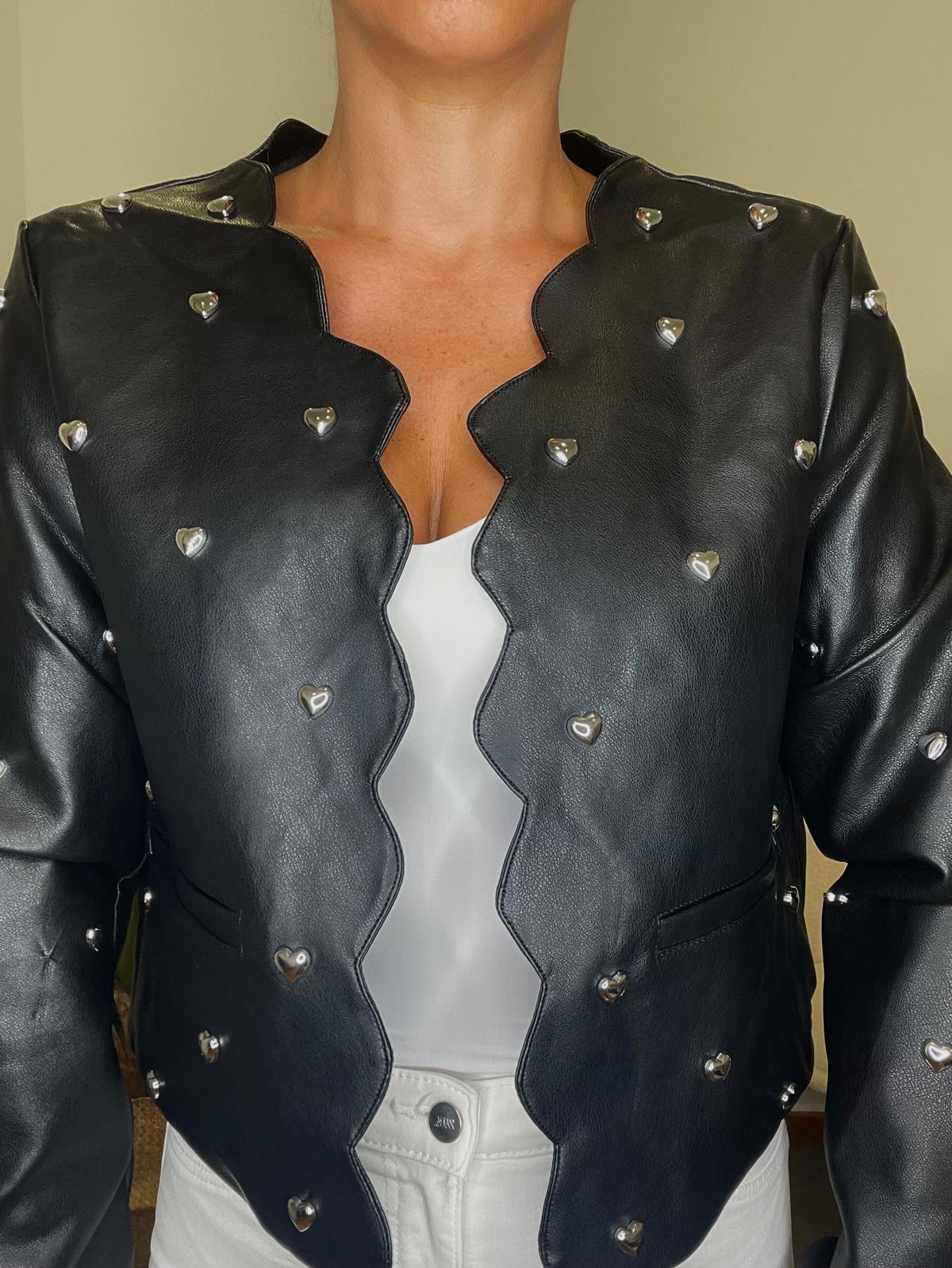 Chaqueta efecto piel de cuello redondo y manga larga. Detalle de corazones metálicos en la parte delantera y trasera. Parte frontal con picos efecto cierre.