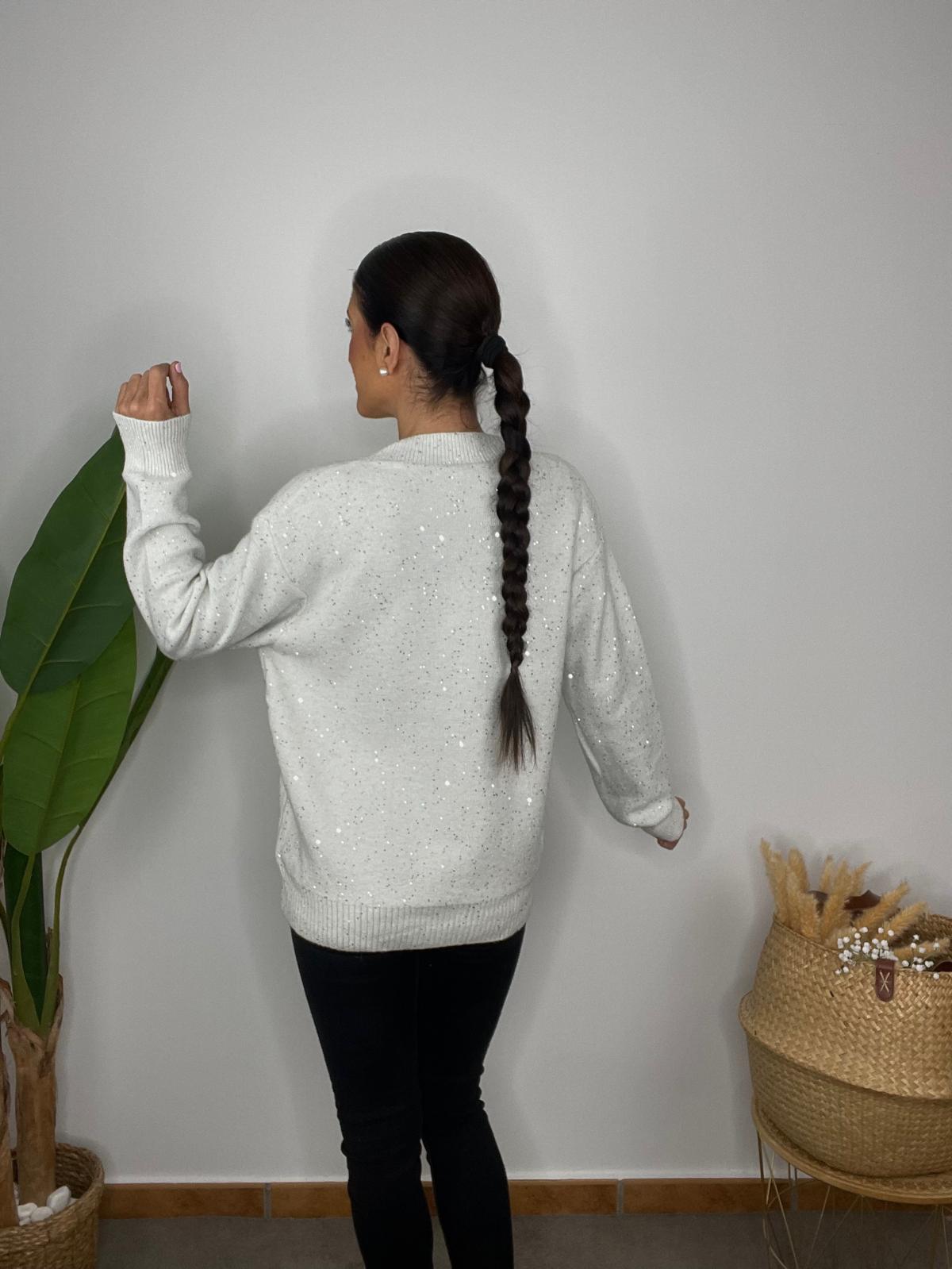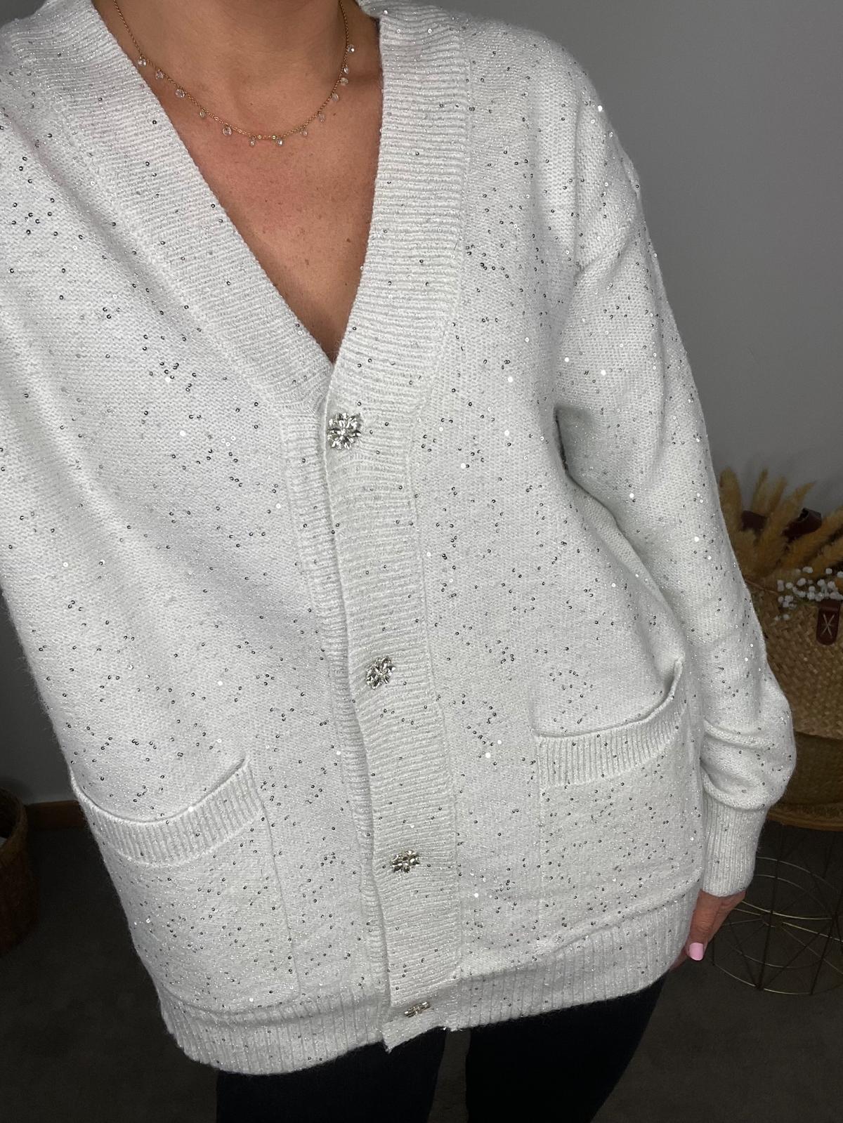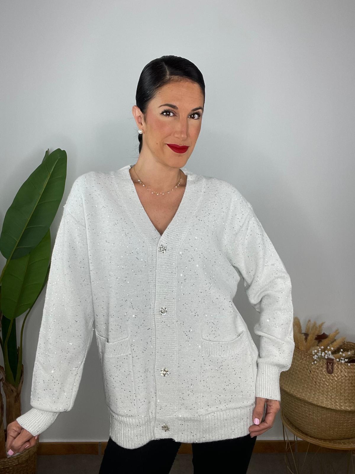 Chaqueta de manga larga y escote en pico. Tejido de punto con brillo y detalle de botones joya.