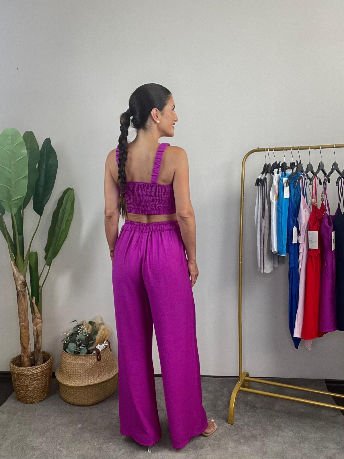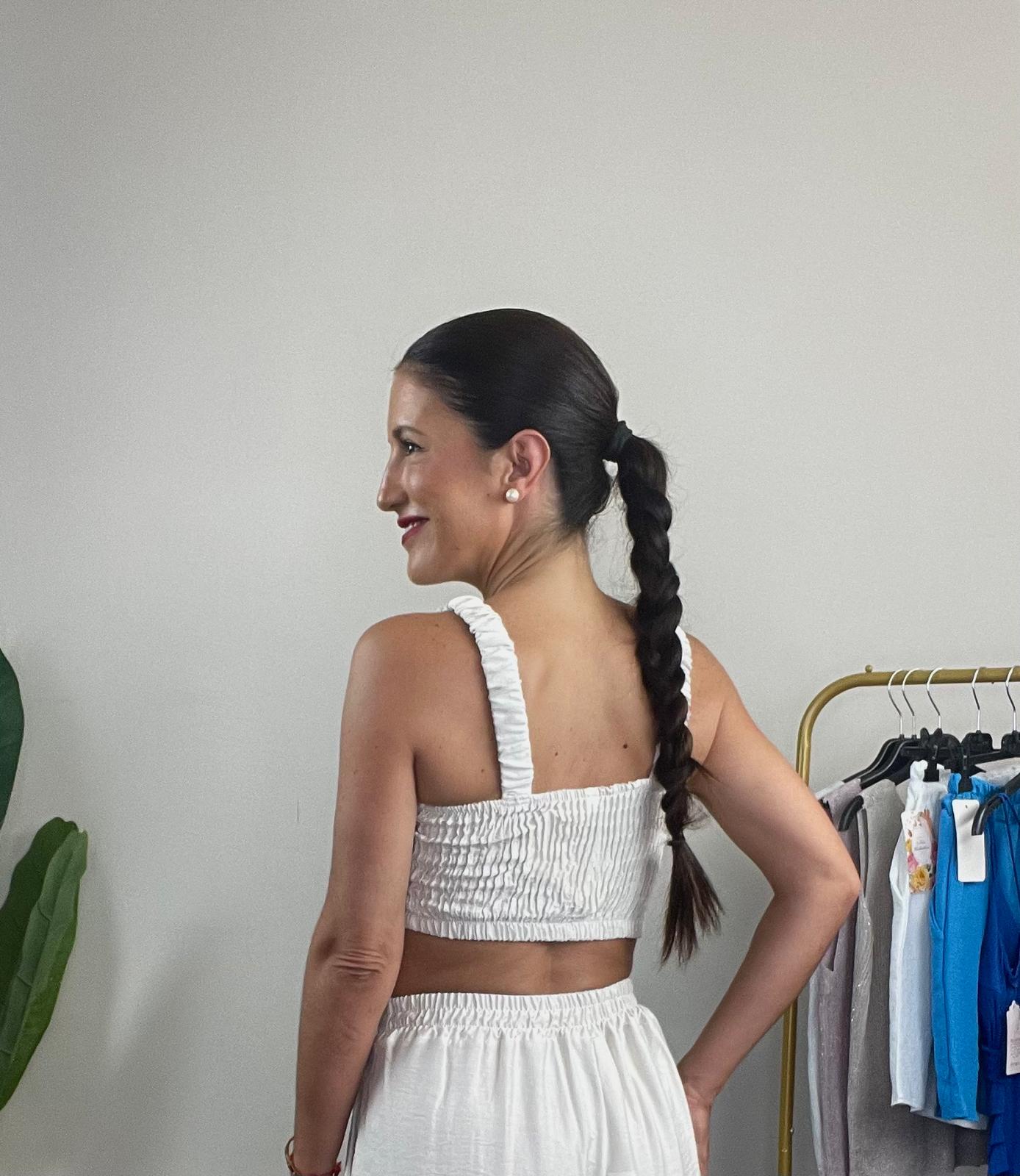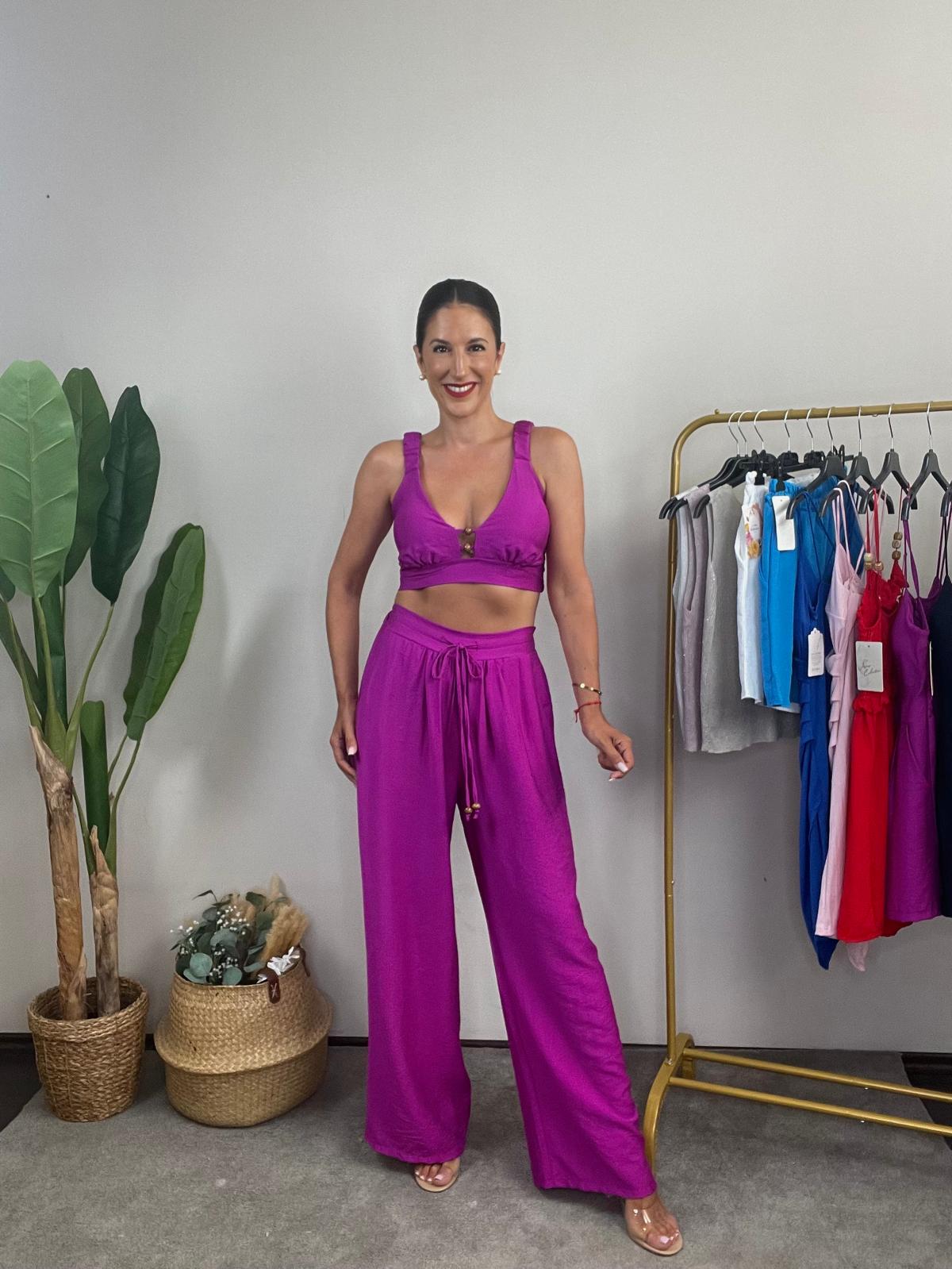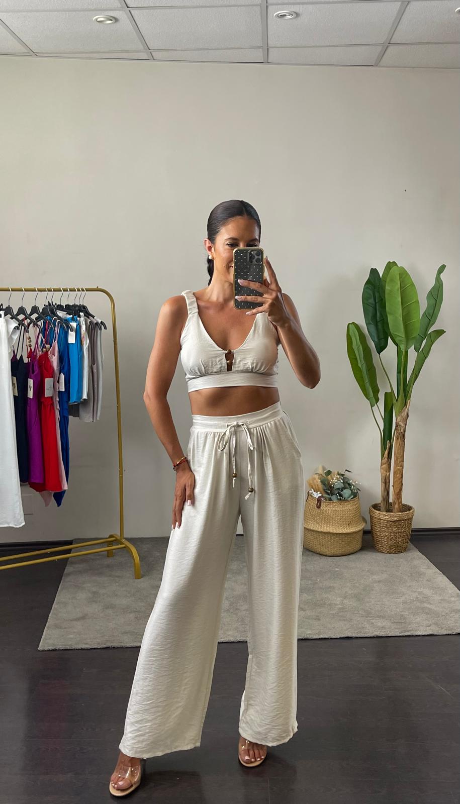 Conjunto de top y pantalón. Top con cascos incorporados en la parte del pecho. Detalle de abalorios en la parte del escote. Tirante elástico y parte trasera elástica tipo nido de abeja. Pantalón ancho de tiro alto con cintura elástica y detalle de cordón con abalorios en la parte delantera.