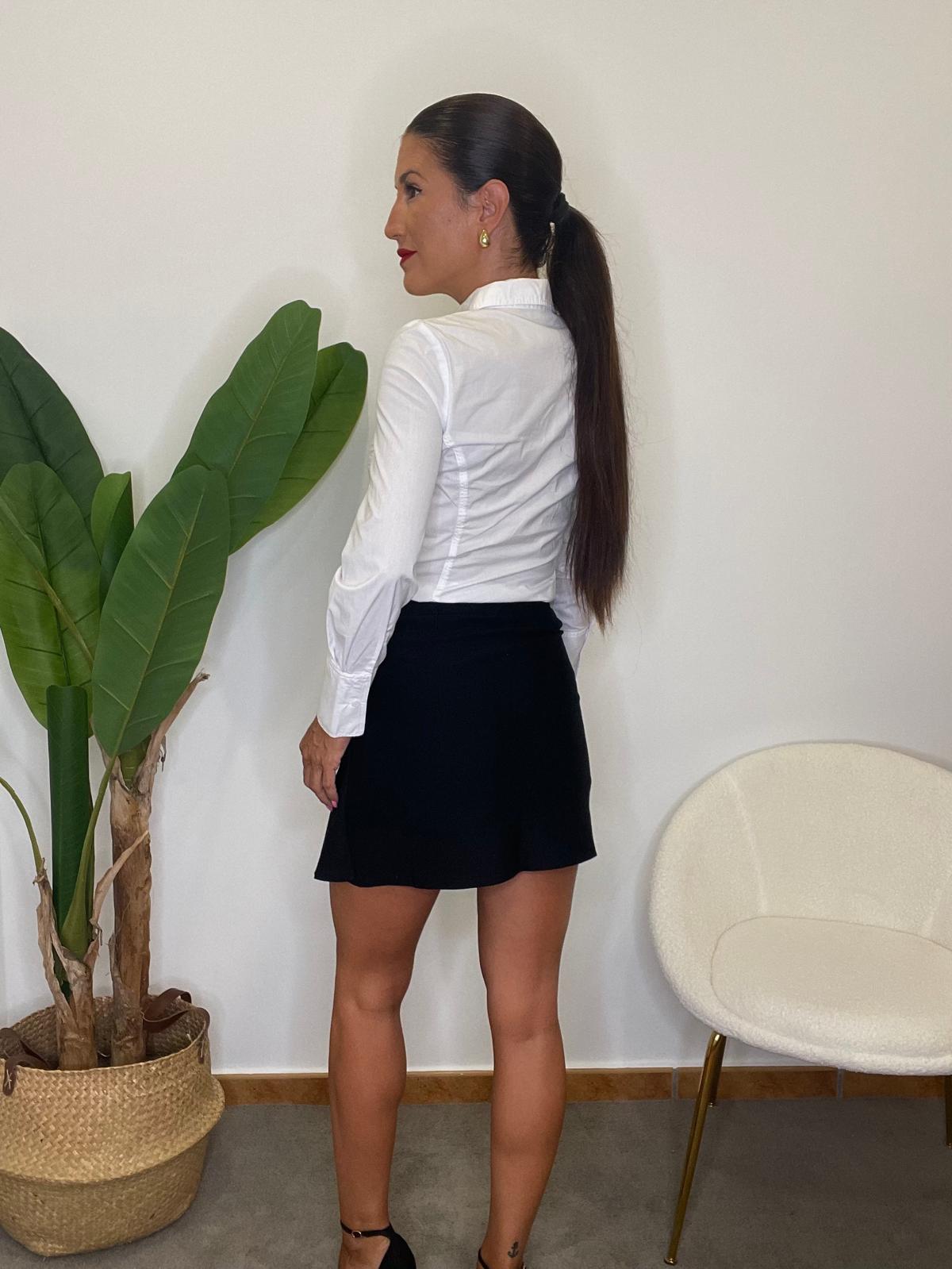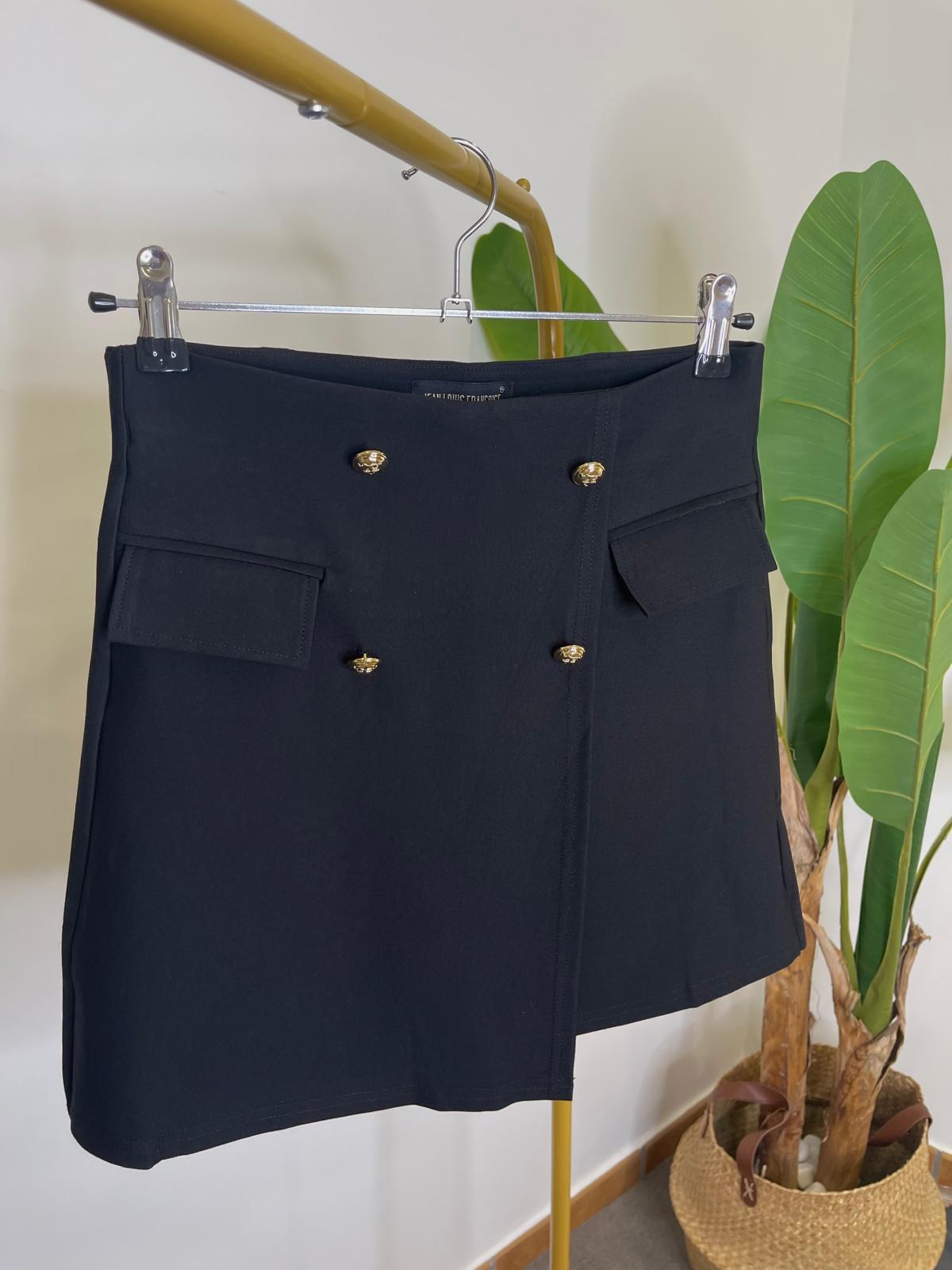 Falda pantalón de tiro alto con bolsillos con solapa delanteros. Tejido elástico y cintura con goma elástica. Detalle de botones metálicos dorados decorativos en la parte delantera. Efecto cierre frontal cruzado.