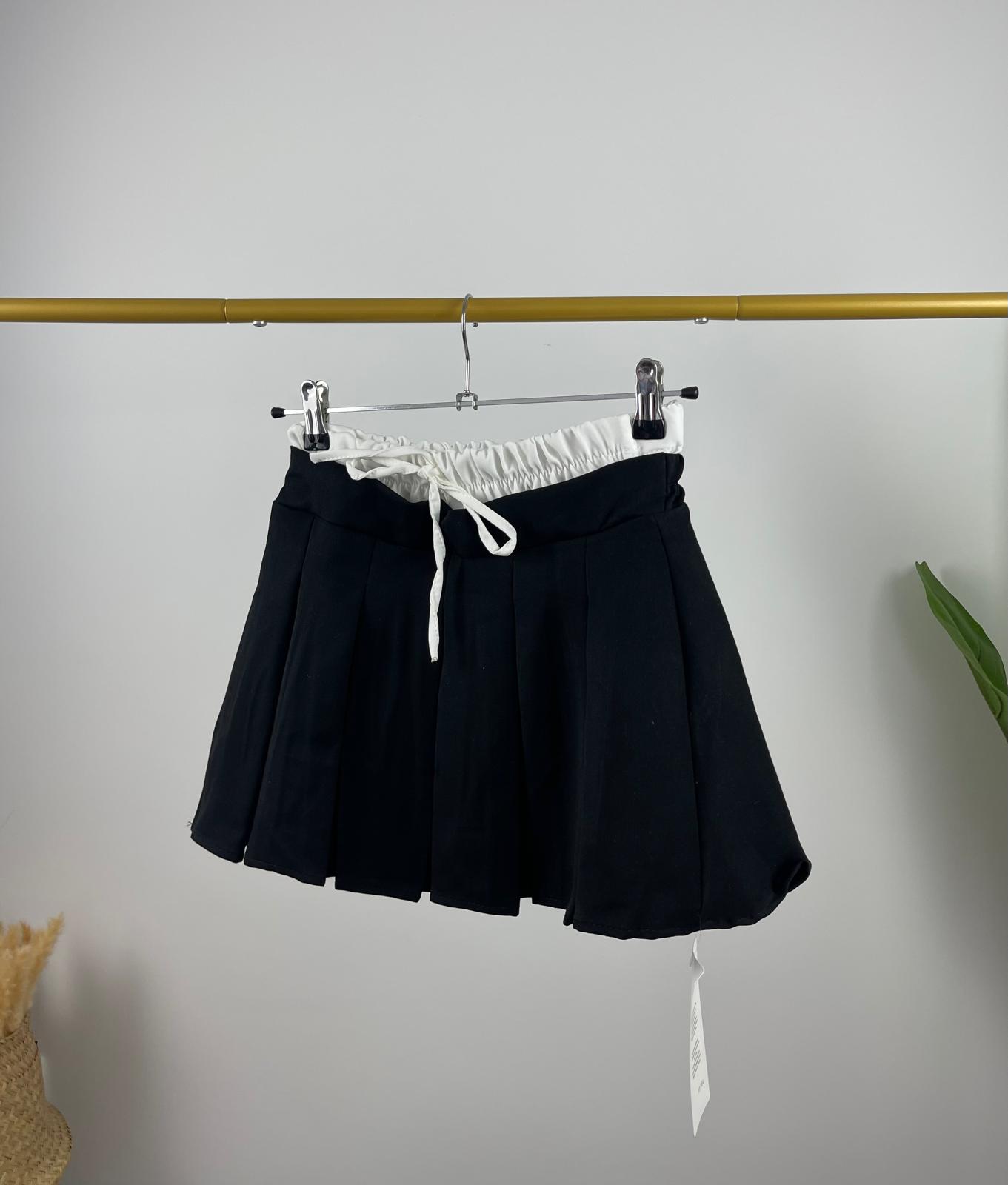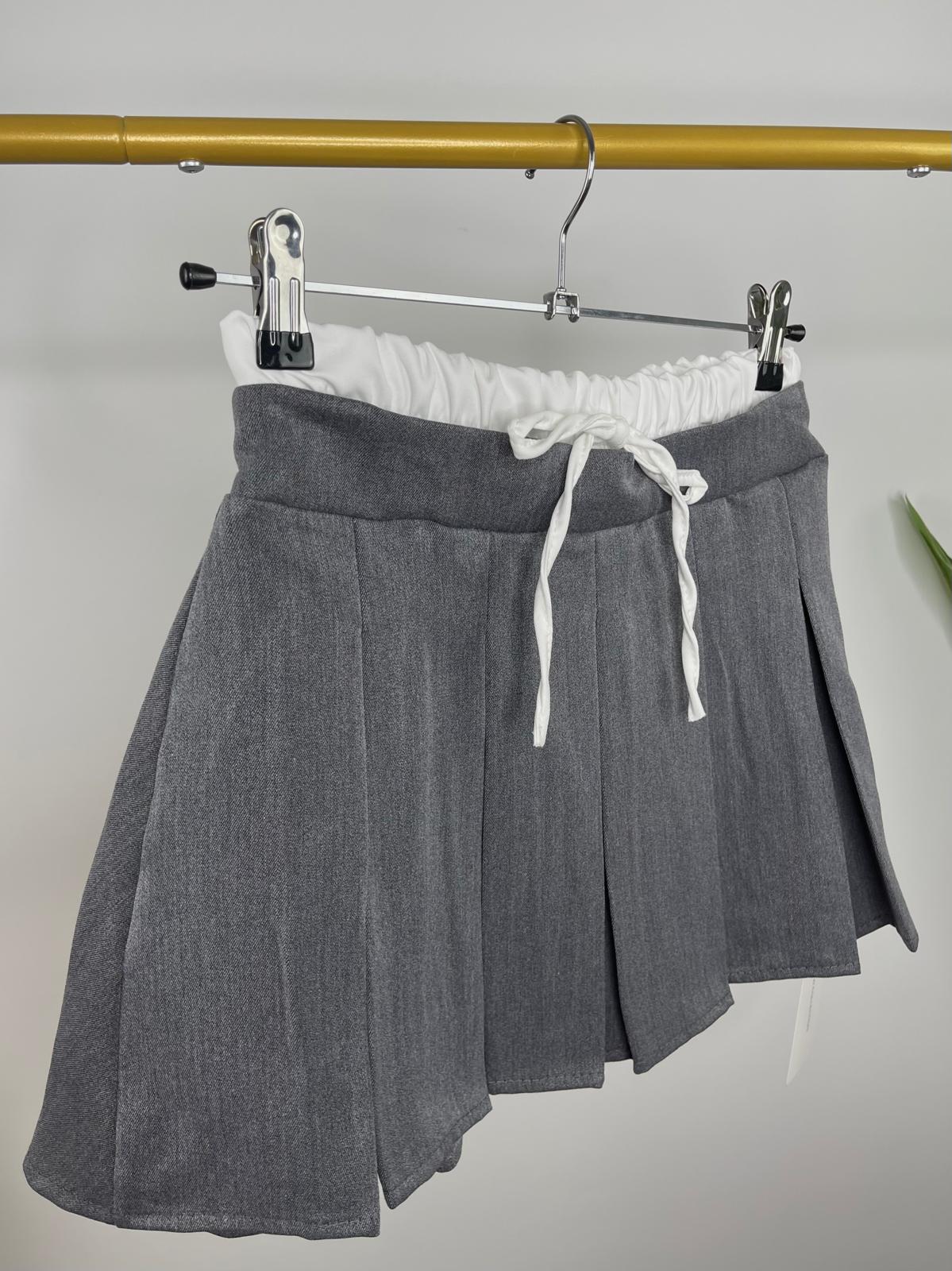 Falda pantalón de tablas con efecto doble cintura. Detalle de goma elástica en la cintura y lazo no ajustable en el mismo tejido. Forro interior efecto pantalón.