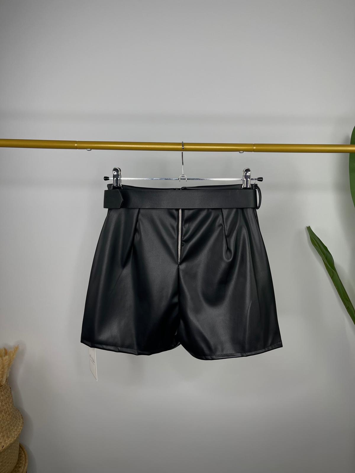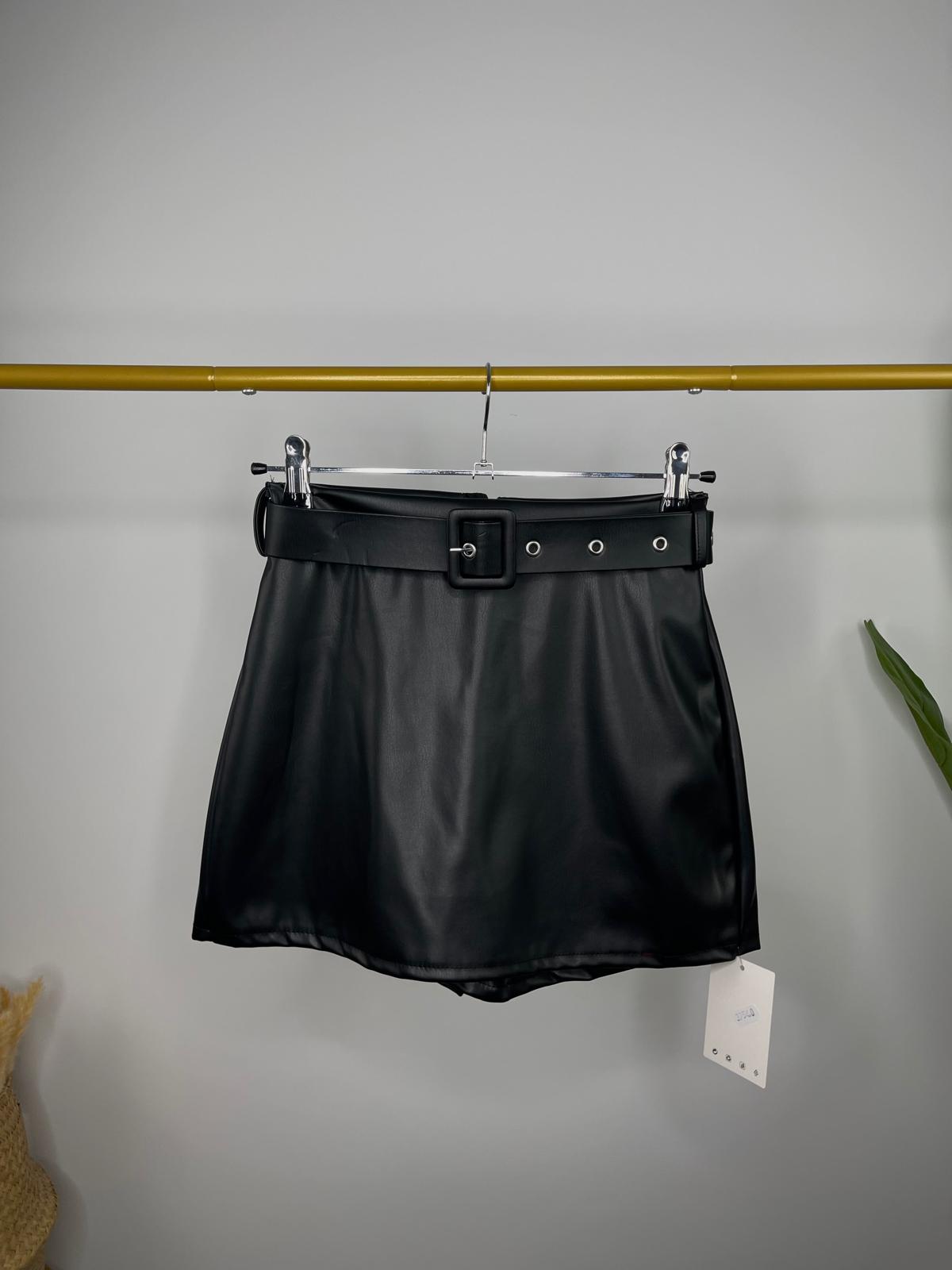 Falda pantalón efecto piel con cinturón incluido en el mismo tejido. Cierre con cremallera en la parte trasera oculta en costura.