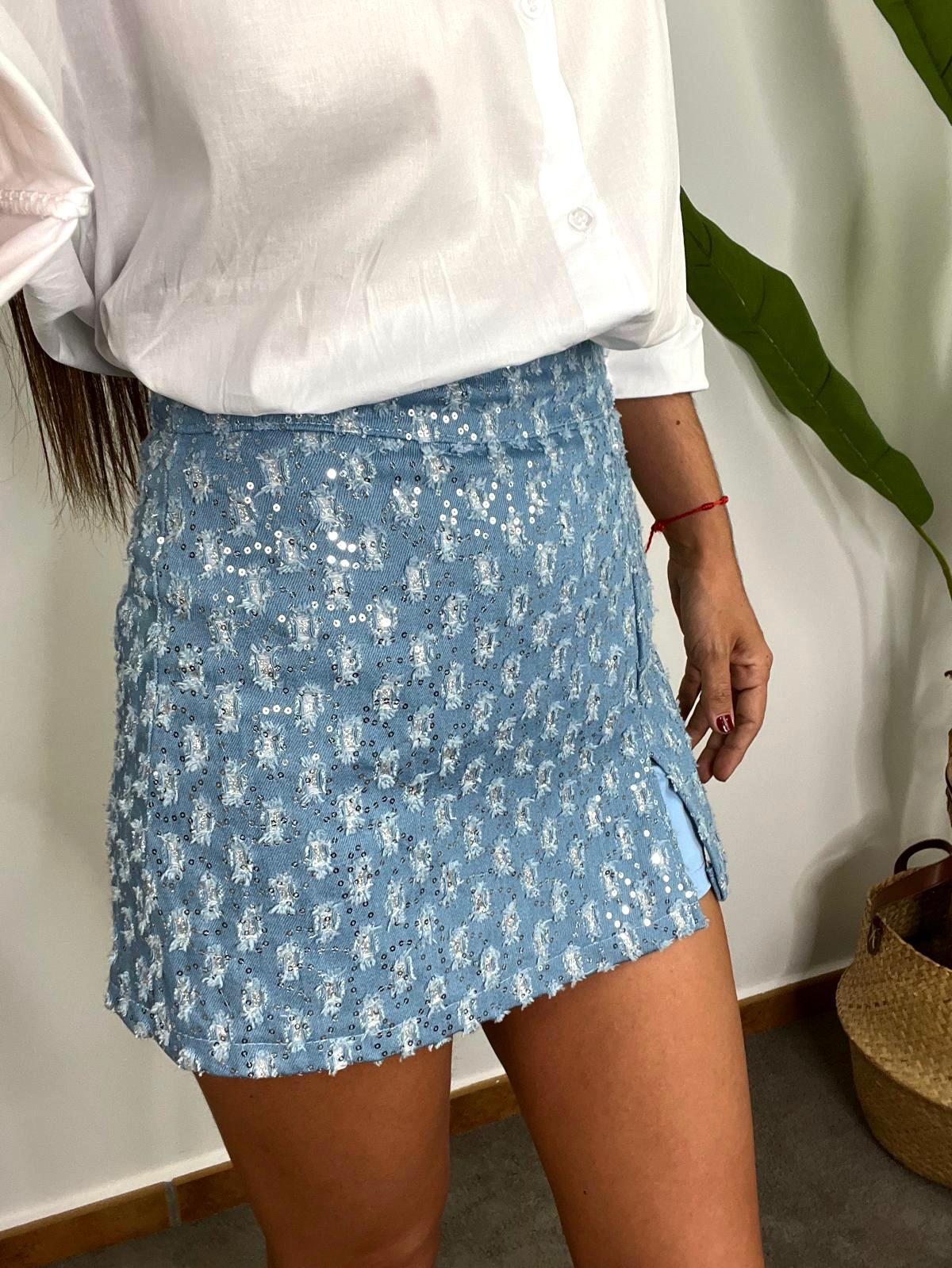 Falda pantalón con tejido efecto denim. Detalle de lentejuelas. Bajo con pequeña abertura delantera. Cierre lateral con cremallera oculta en costura.