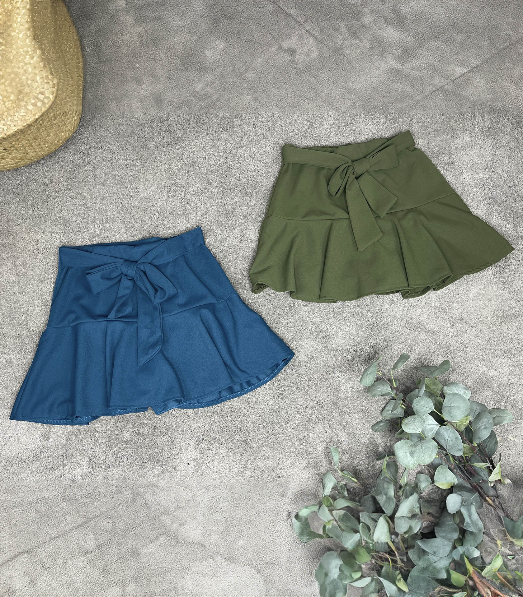 Falda pantalón de tela elástica. Cinturón en mismo tejido con lazada en la parte delantera. El cinturón es fijo aunque se puede ajustar la lazada. Bajo en forma de volante. Elástico en la parte trasera a la altura de la cintura.
