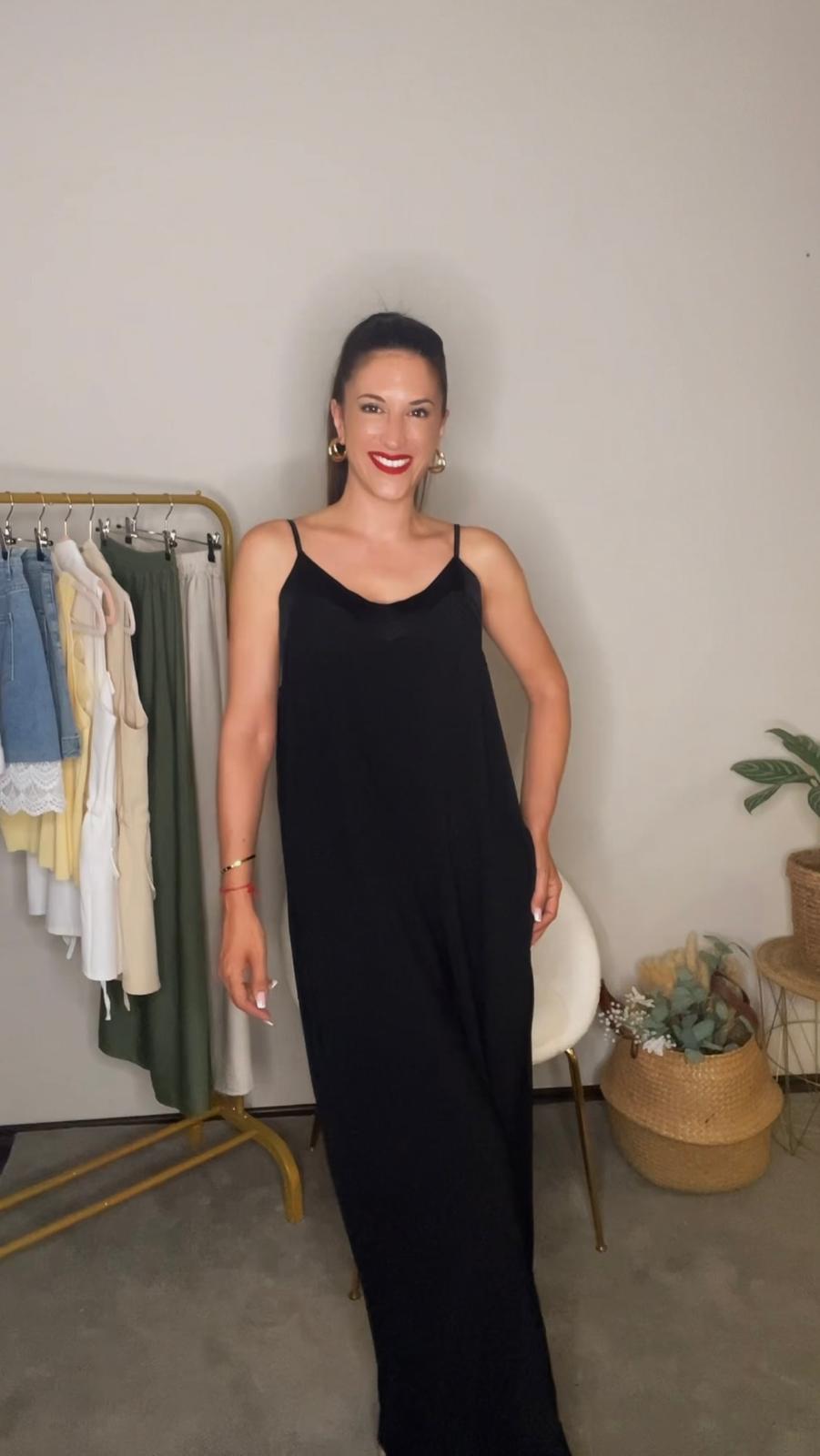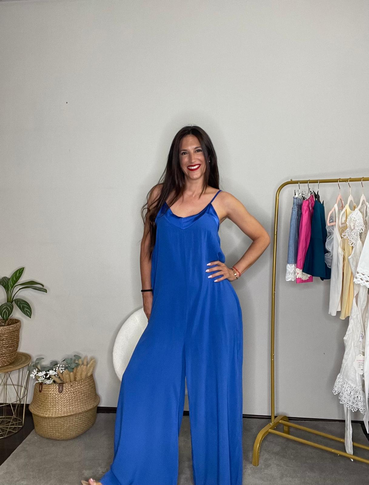 Mono fluido de escote en pico y tirantes finos. Detalle de tela de raso en el escote delantero. Parte trasera con goma muy elástica. Pernera ancha.