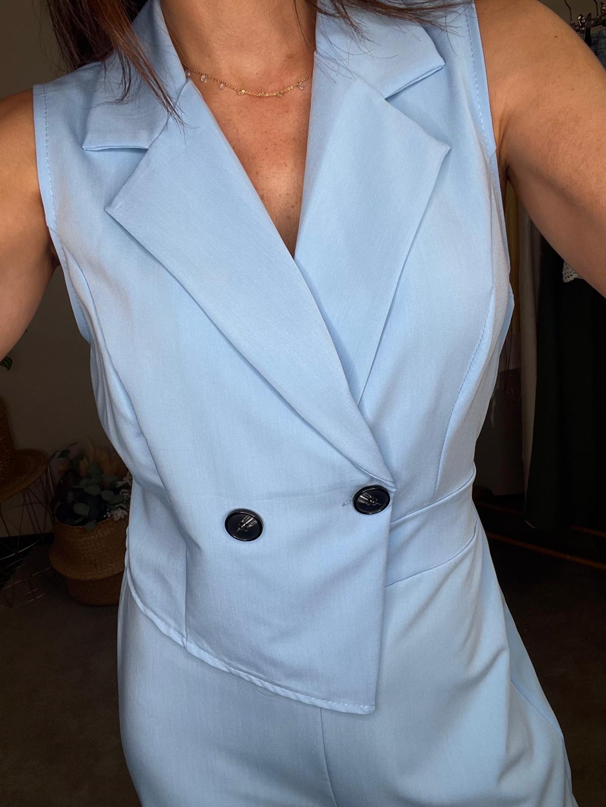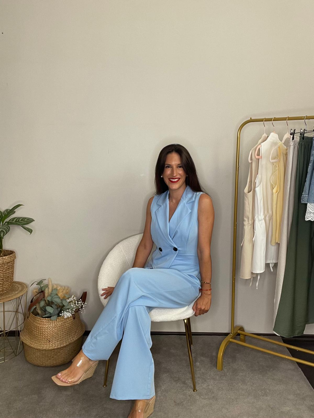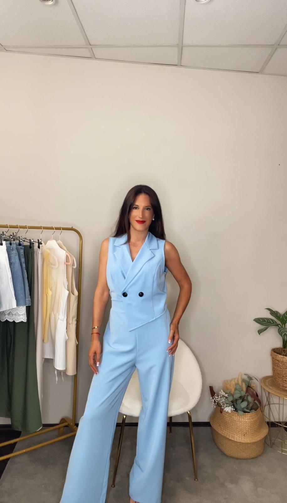 Mono de cuello solapa y manga sisa. Cintura entallada con goma elástica en la parte trasera. Detalle de solapas delanteras. Cierre frontal cruzado con botón.