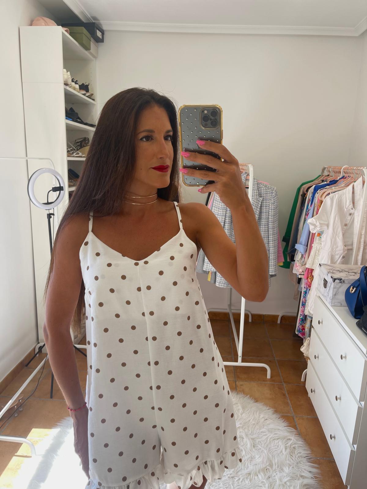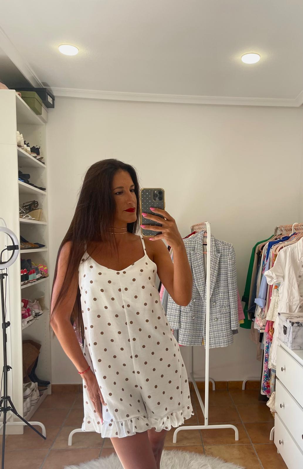 Mono fluido corto con escote en pico. Tirante fino y estampado de lunares. Bajo acabado en mini volante. Forro interior en la parte del pecho.
