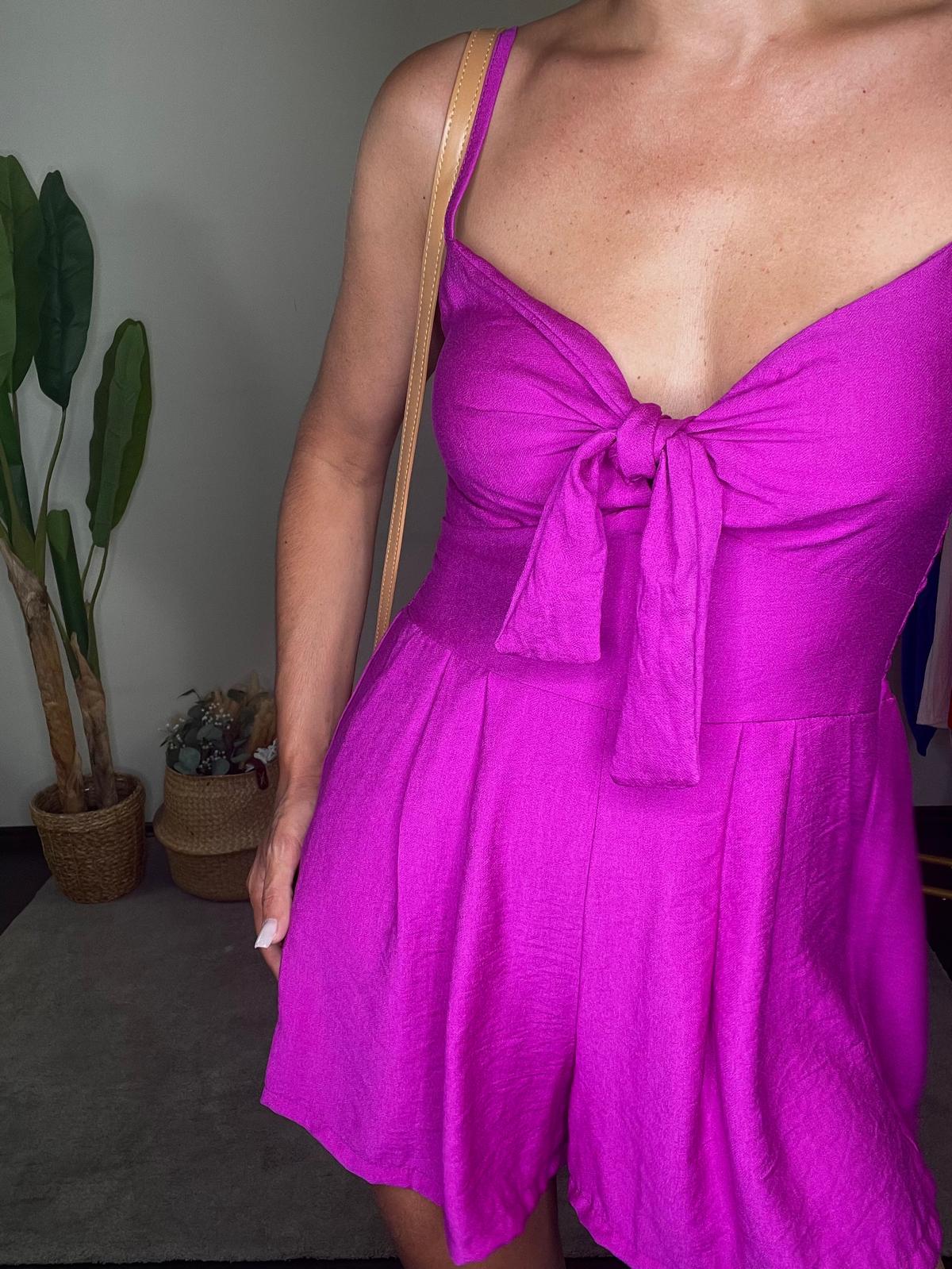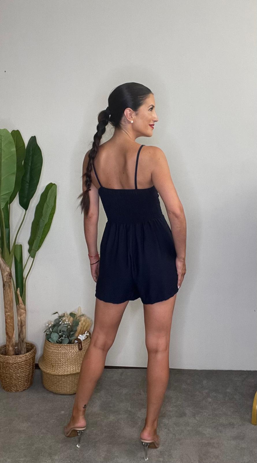 Mono corto de escote en pico y lazada. Tirantes finos. Cintura con pinzas delanteras y bolsillos. Parte de la espalda tipo nido de abeja.