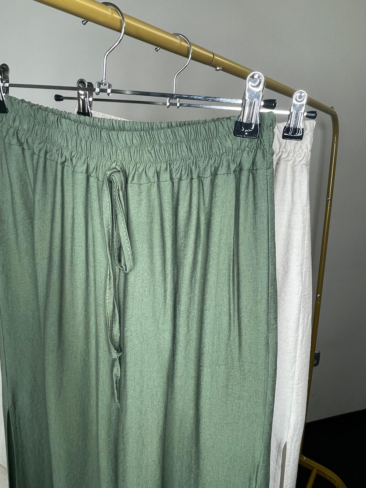 Pantalón largo de lino con detalle de apertura en el lateral de cada pierna. Cintura elástica con lazada frontal.