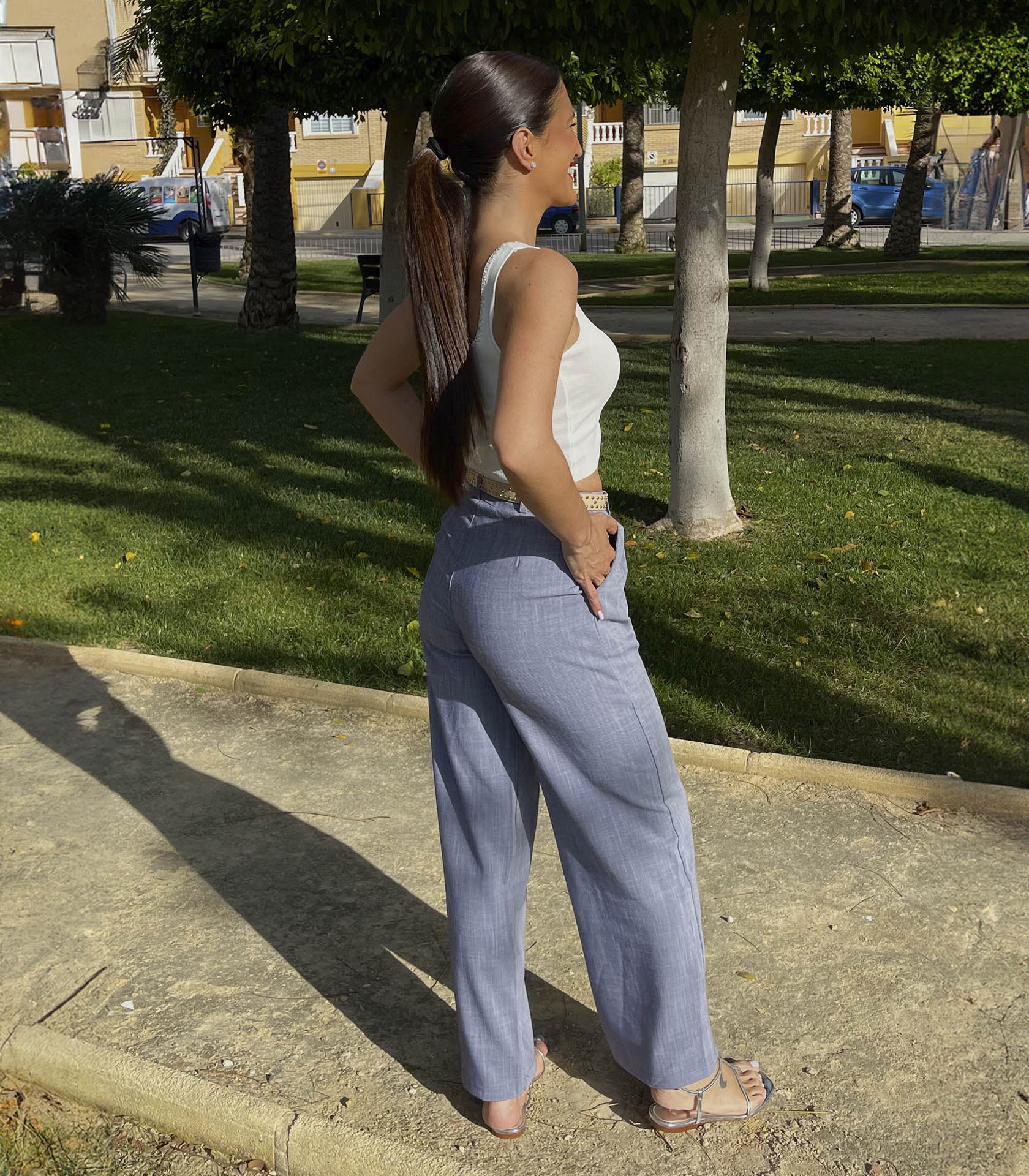 Pantalón de tela fina. Tiro alto con pinzas delanteras. Bolsillos frontales. Pernera ancha. Cierre frontal con botón y cremallera oculta por solapa. Detalle de cinturón beige con tachuelas y hebilla dorada.
