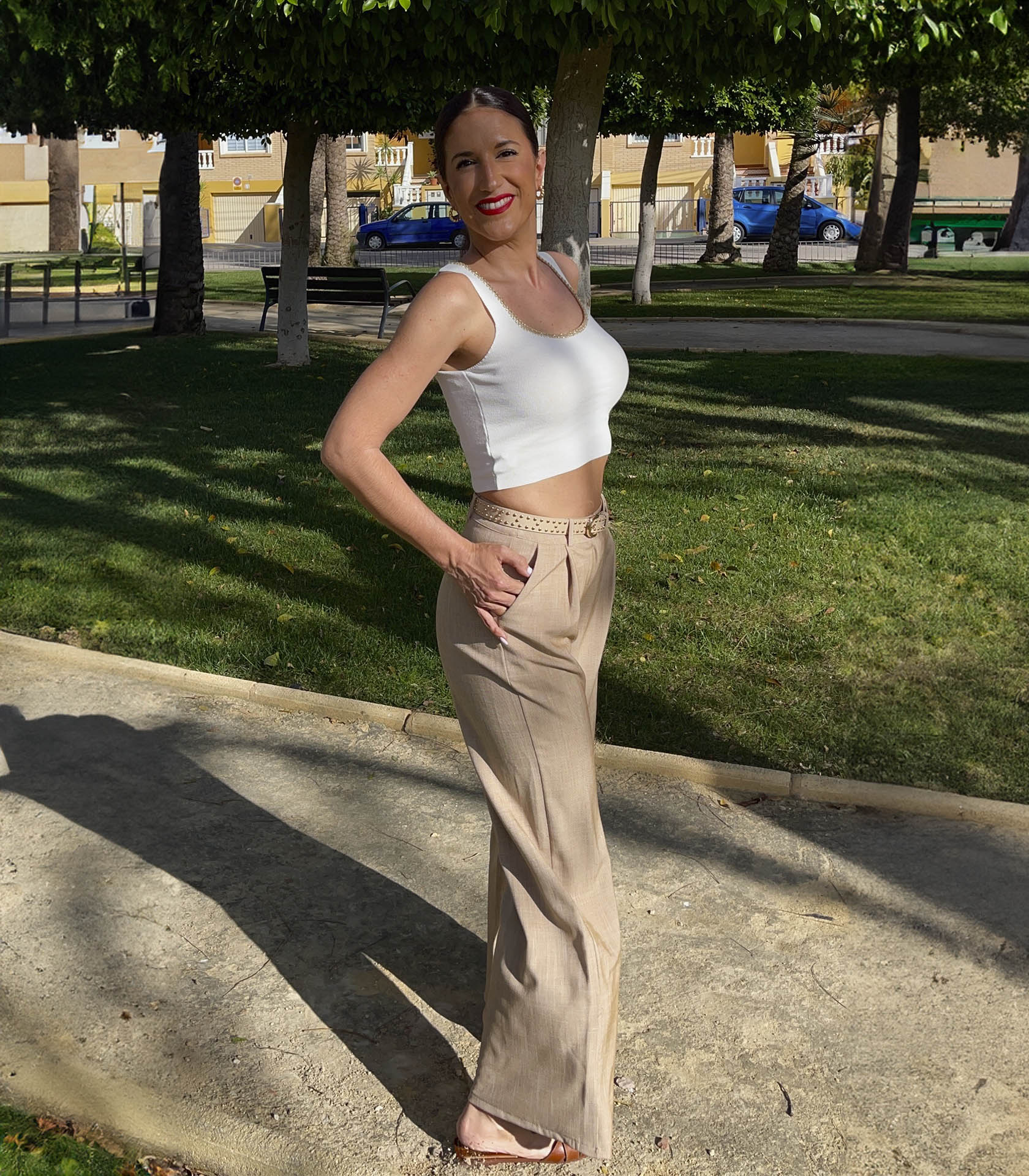 Pantalón de tela fina. Tiro alto con pinzas delanteras. Bolsillos frontales. Pernera ancha. Cierre frontal con botón y cremallera oculta por solapa. Detalle de cinturón beige con tachuelas y hebilla dorada.