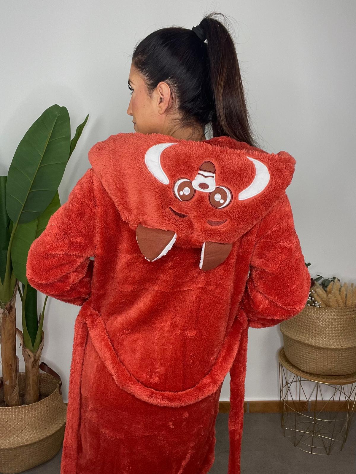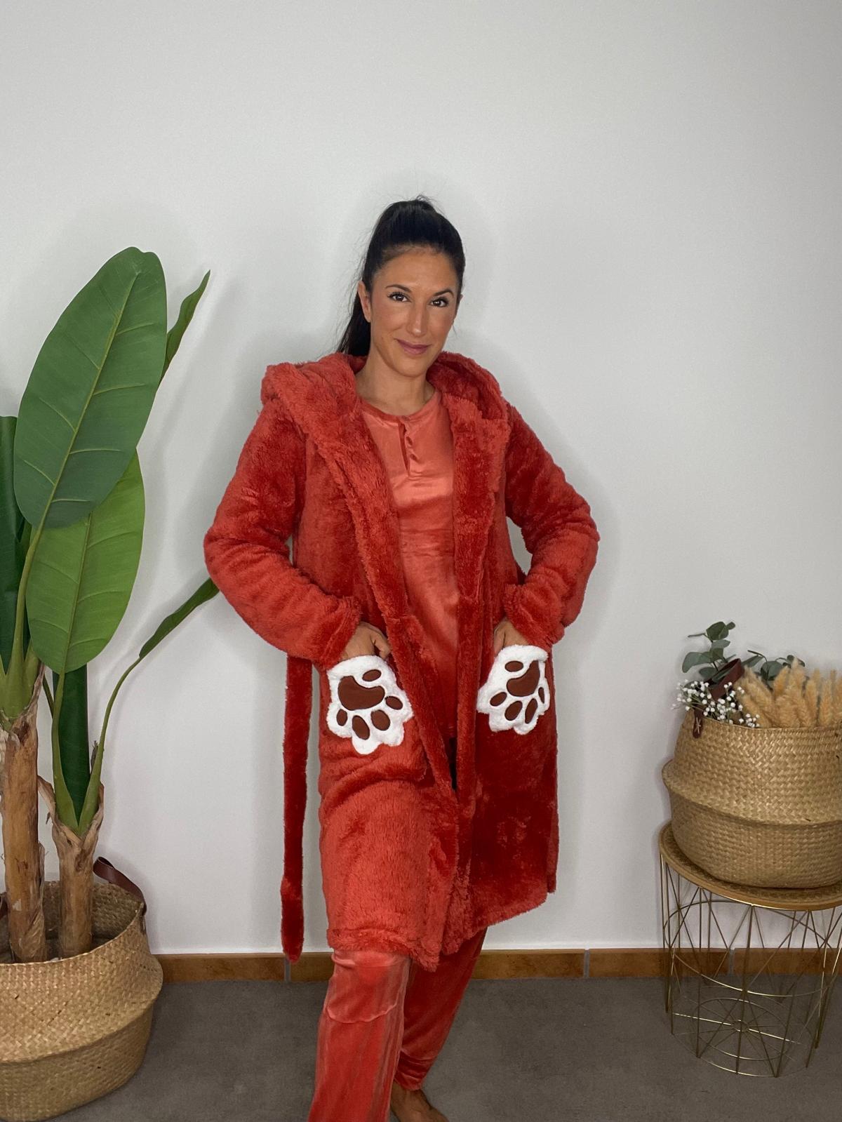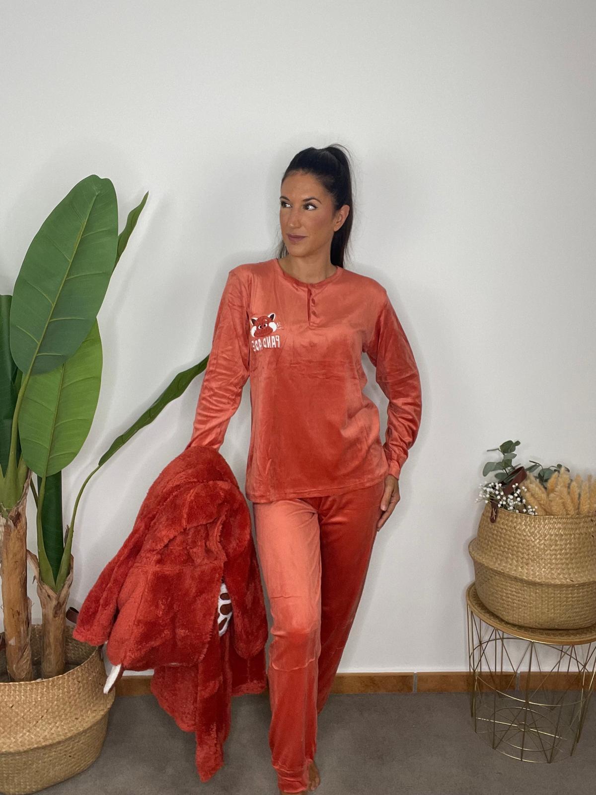 Set de pijama compuesto de 3 piezas. Camiseta de manga larga con tejido efecto terciopelo y cierre en el escote con 3 botones. Pantalón Largo del mismo tejido con goma elástica en la cintura. Bata de pelo con detalle de panda bordado en la capucha, bolsillos delanteros y cinturón ajustable.