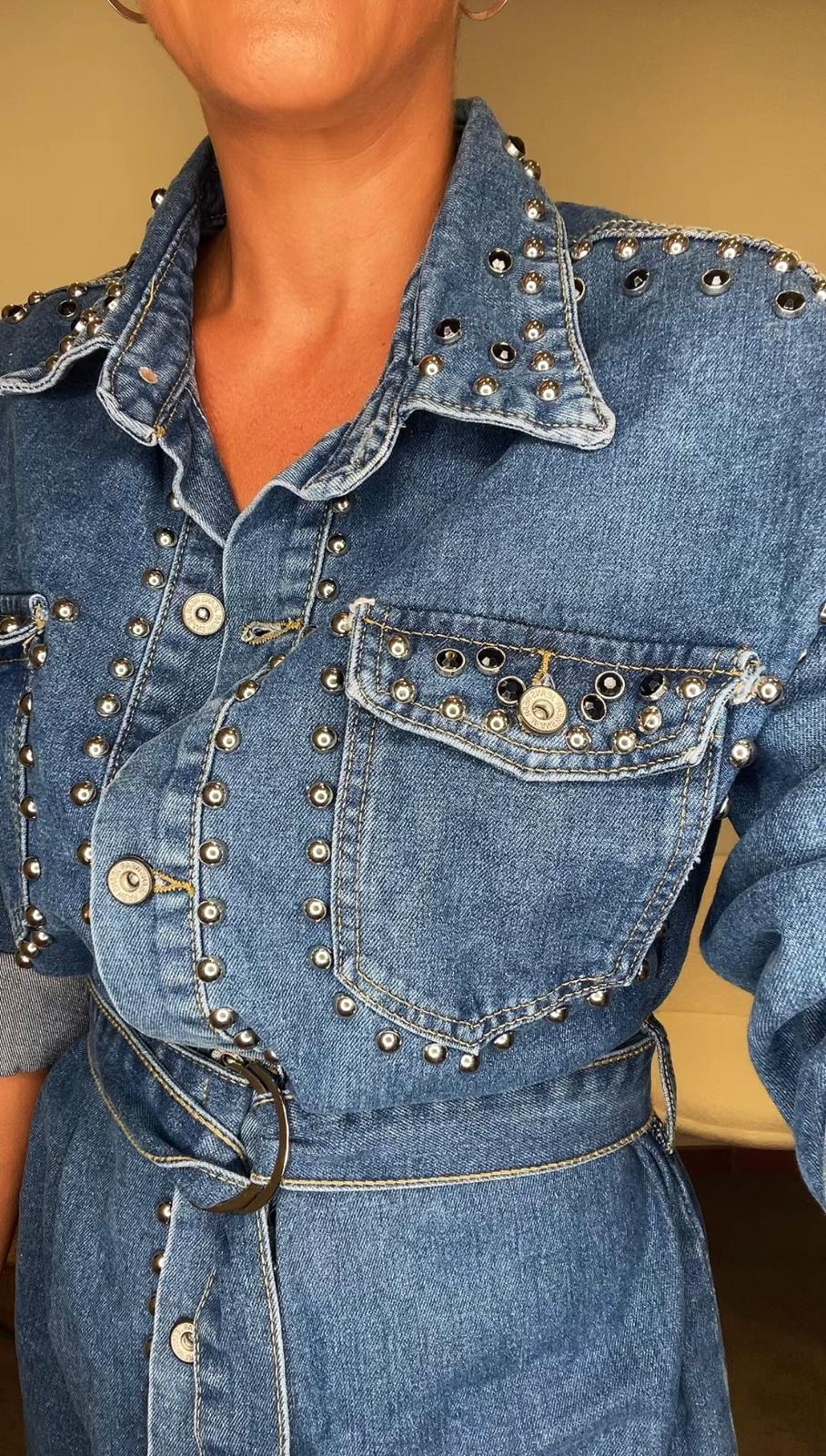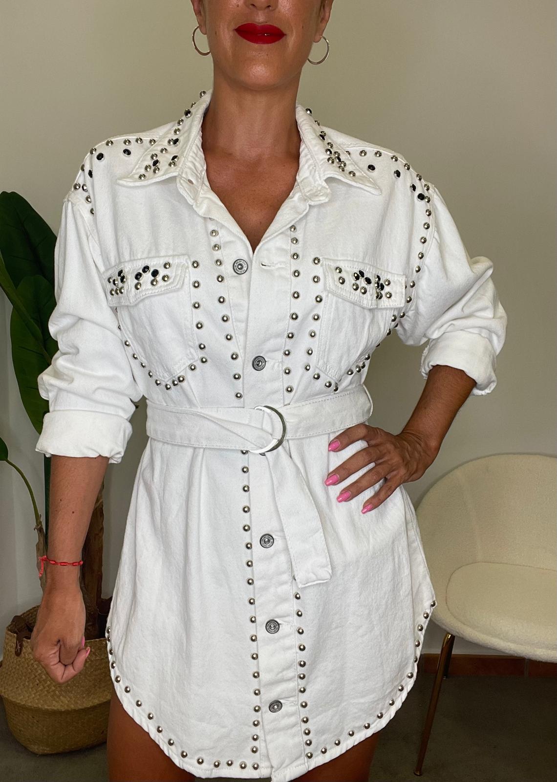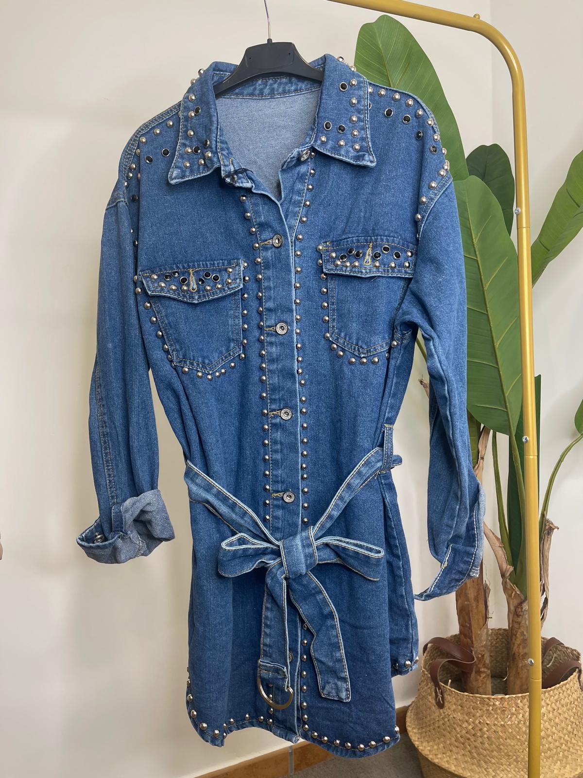 Sobrecamisa de cuello solapa y manga larga acabada en puño. Bolsillos con solapa en la parte delantera. Cierre frontal con botones metálicos. Cinturón ajustable en el mismo tejido con hebilla. Detalle de tachuelas plateadas en la parte delantera.