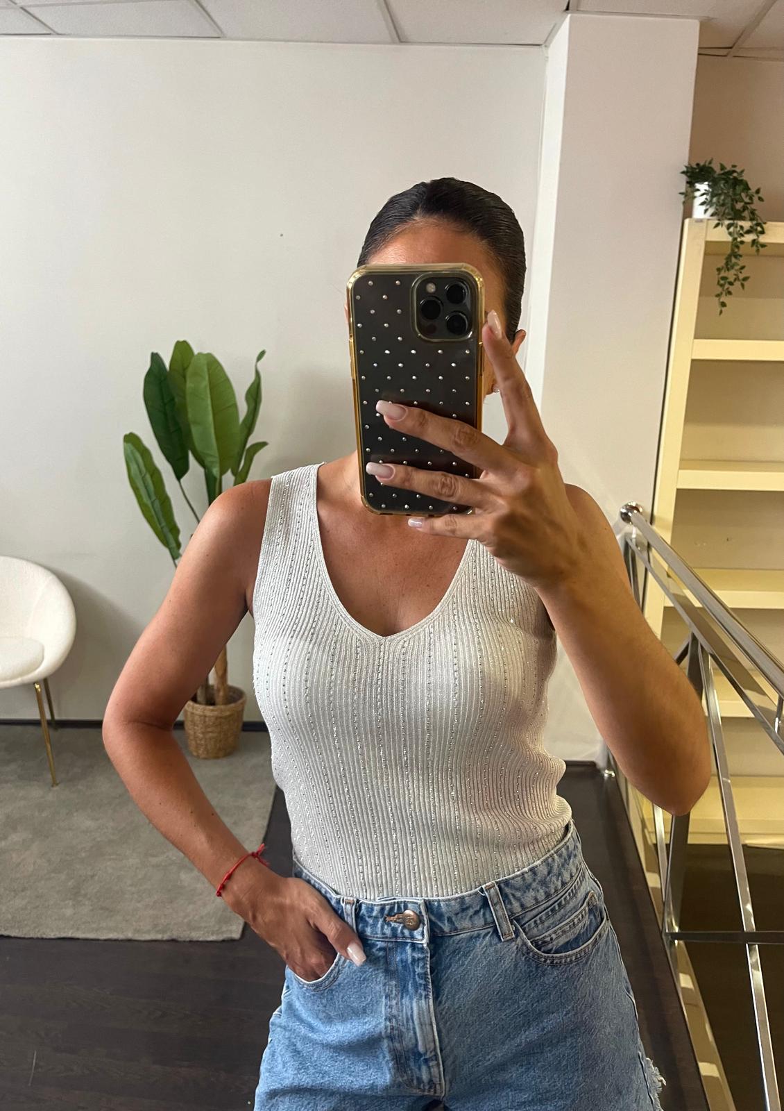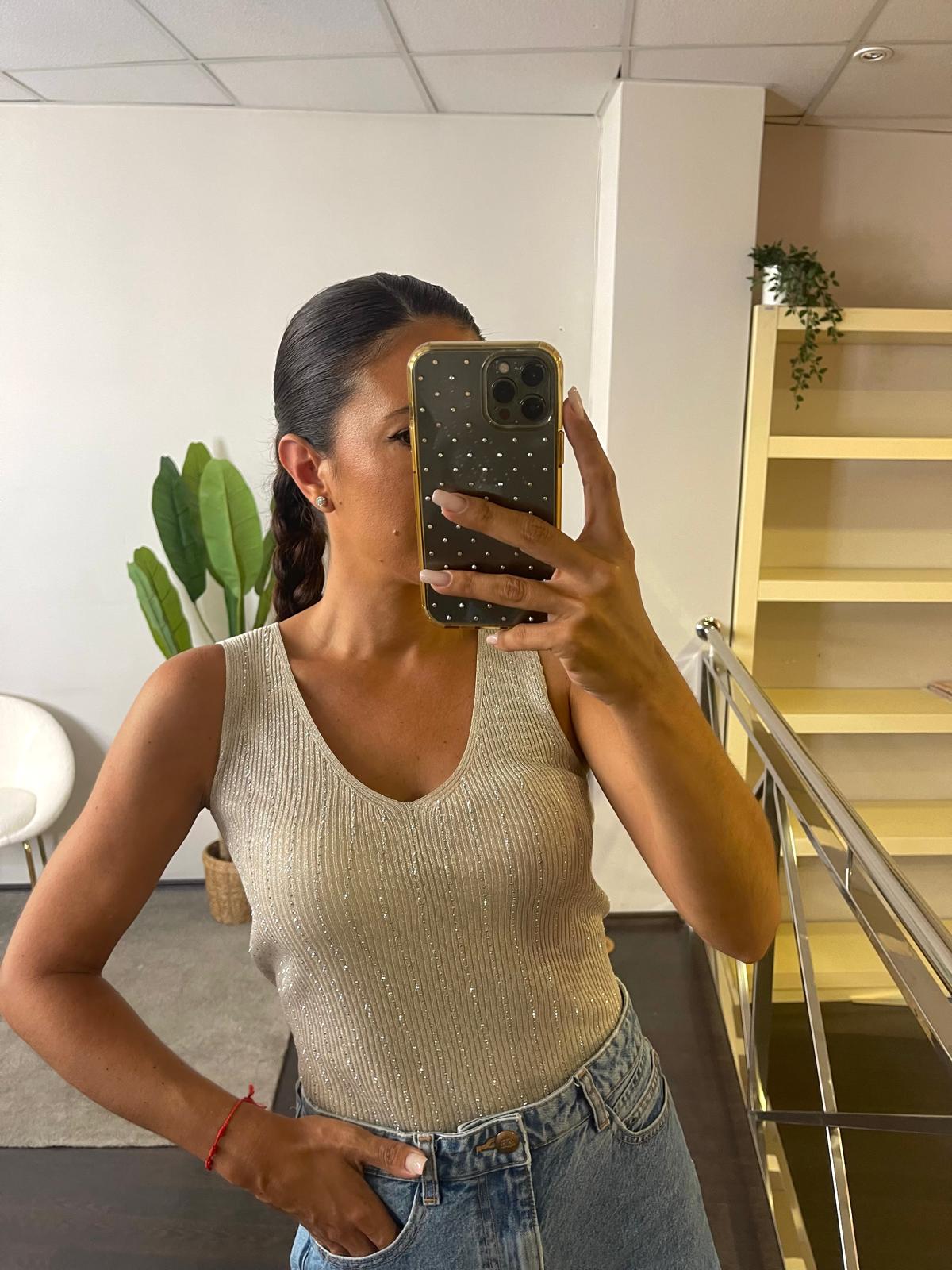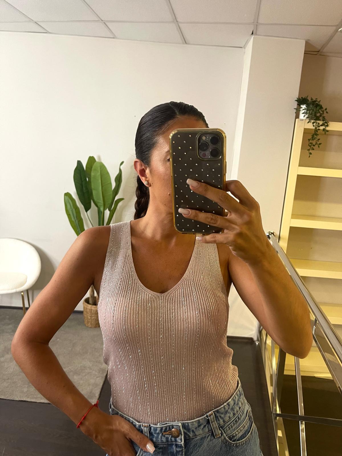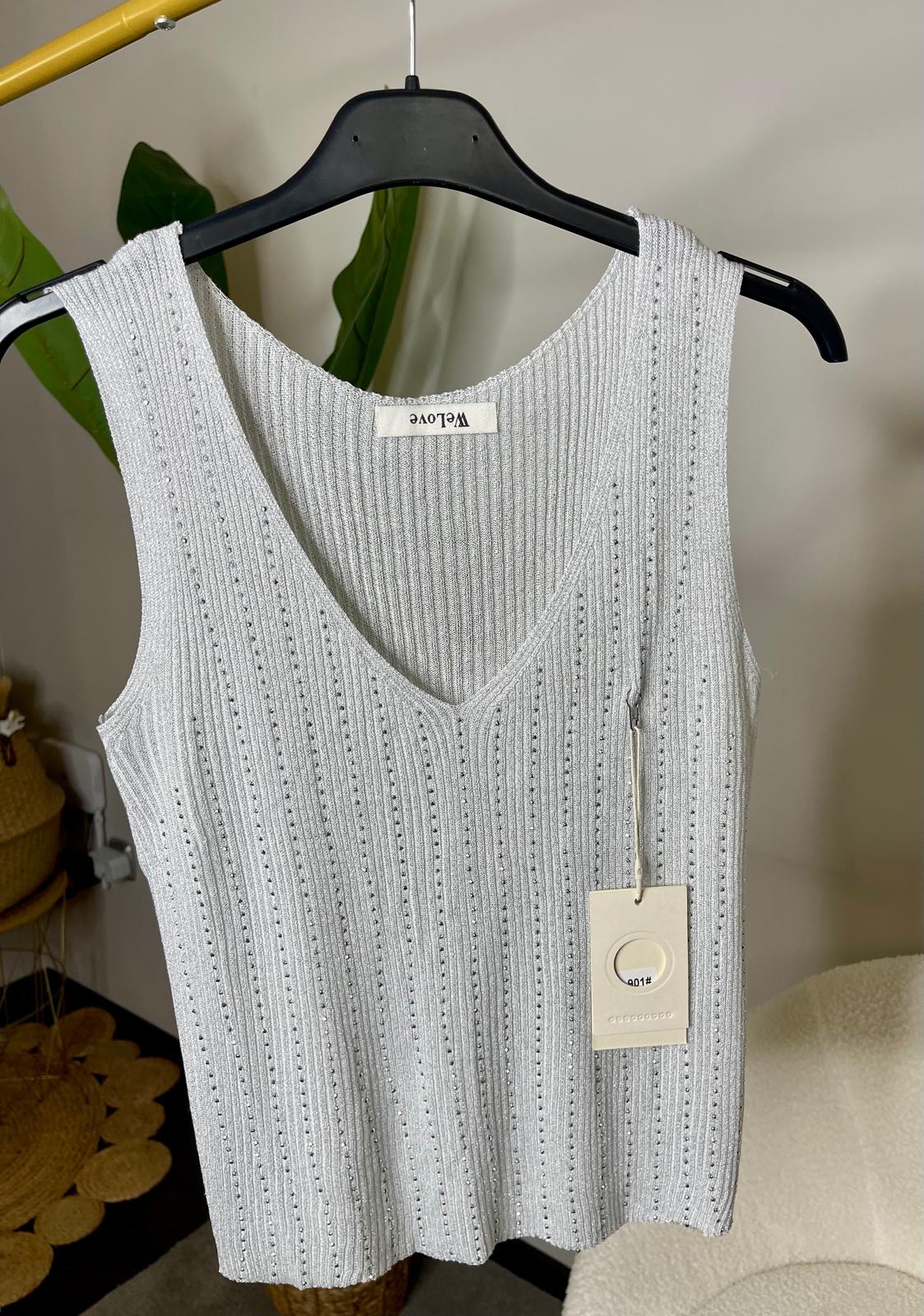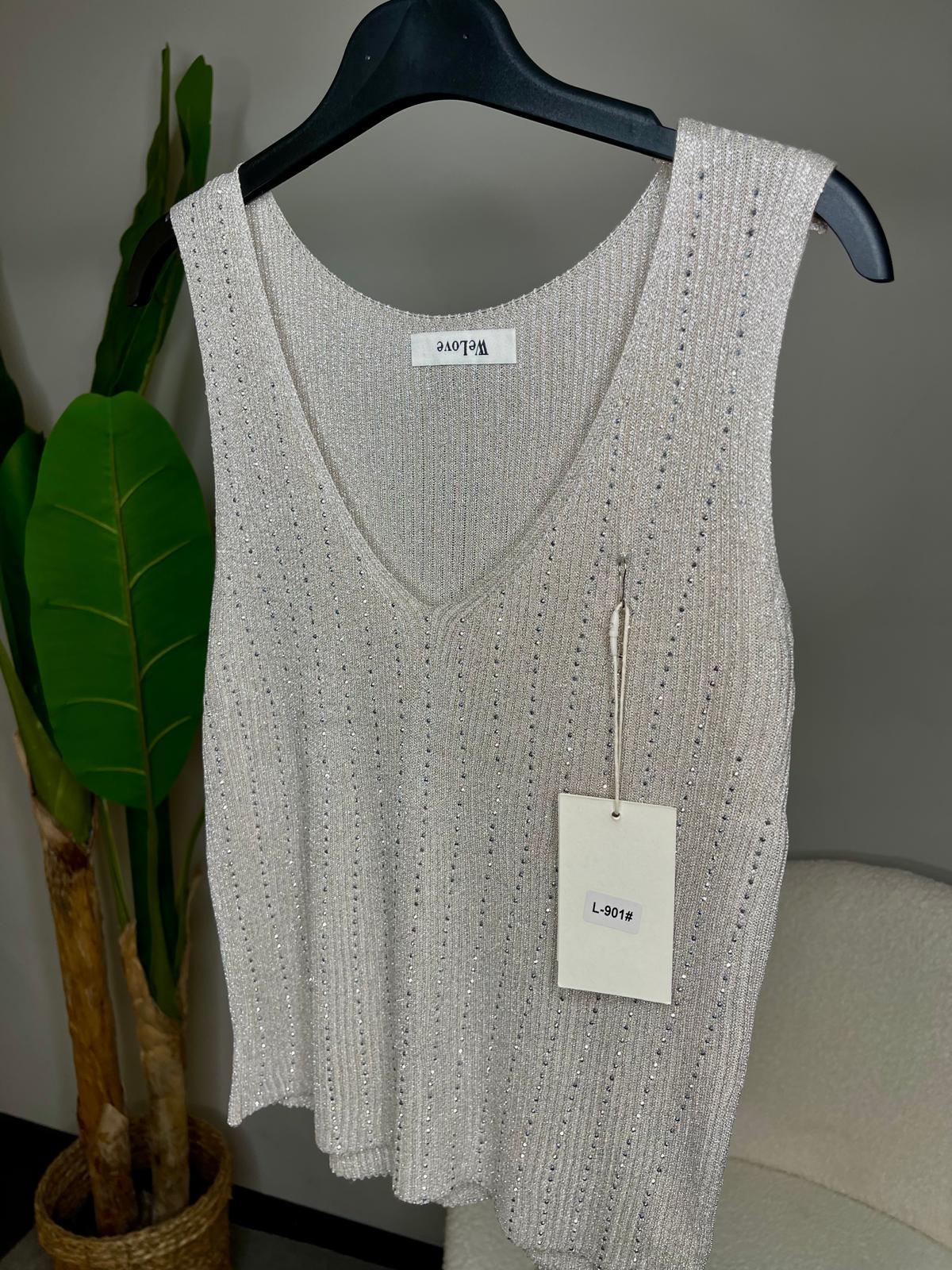 Top punto fino de escote en pico y manga sisa. Detalle aplicación de brillos.