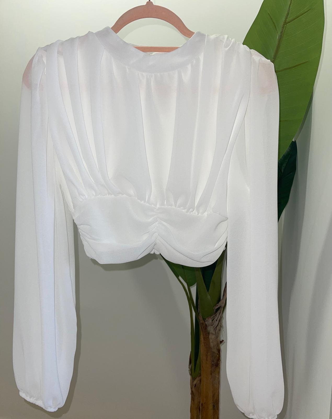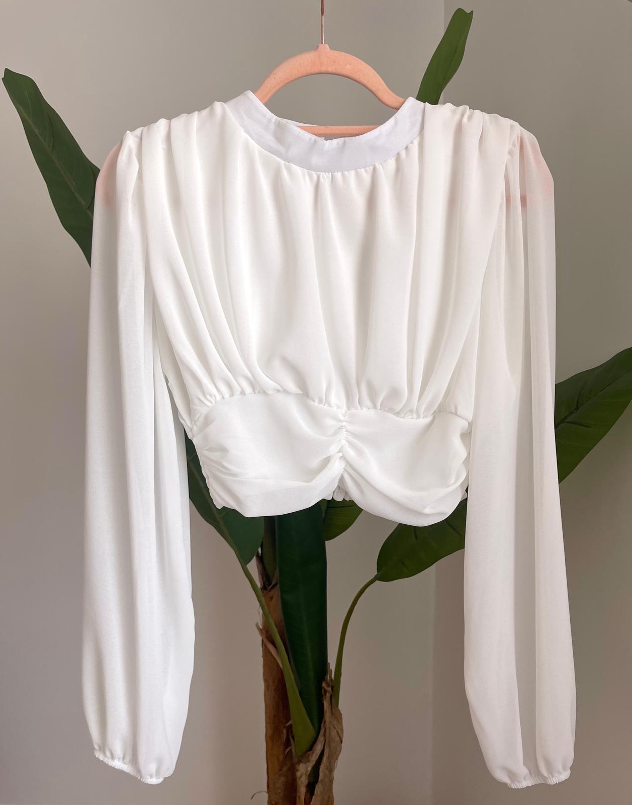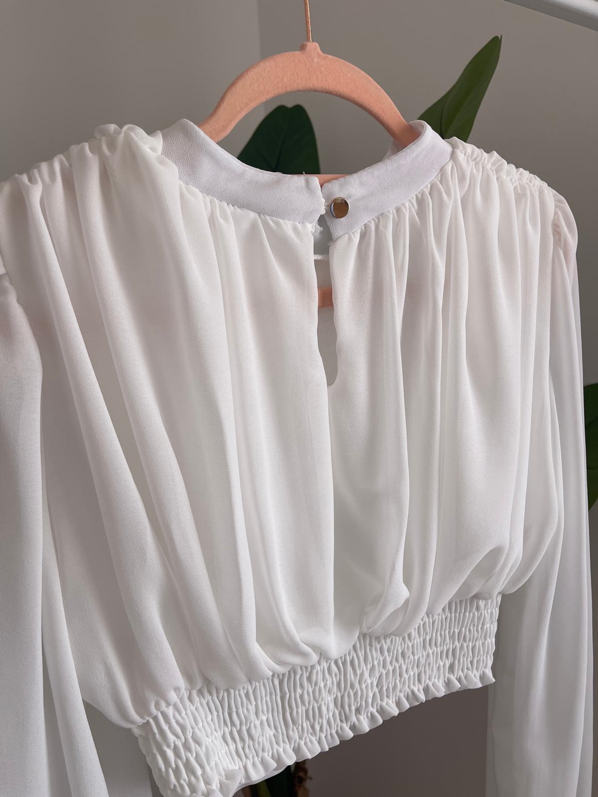 Top blanco de tela semitransparente. Manga larga con elástico en los puños. Cierre trasero con botón. Parte trasera con tela tipo de abeja elástica.
