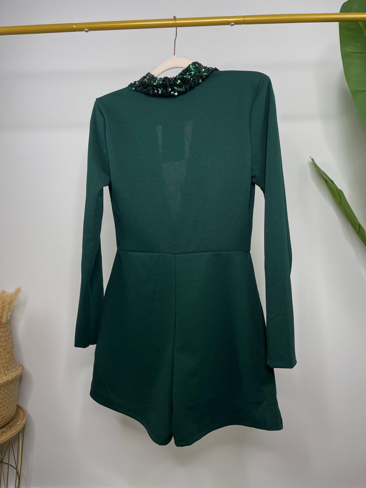 Vestido tipo blazer con pantalón en la parte trasera. Cuello solapa y manga larga. Detalle de lentejuelas verdes en solapas de escote y falsos bolsillos.
