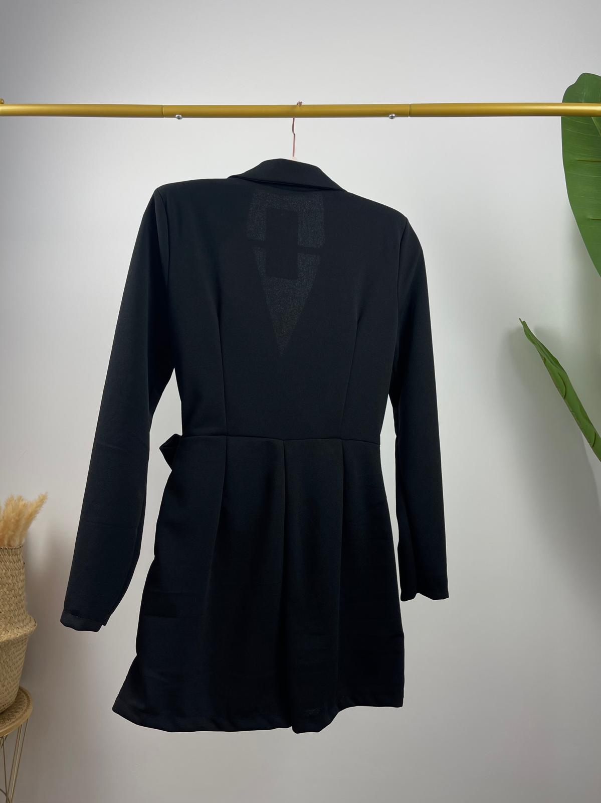 Vestido tipo blazer con pantalón en la parte trasera. Cuello solapa efecto cruzado y manga larga. Detalle de lazo anudado en un lateral. Parte trasera tipo pantalón. Tejido elástico.