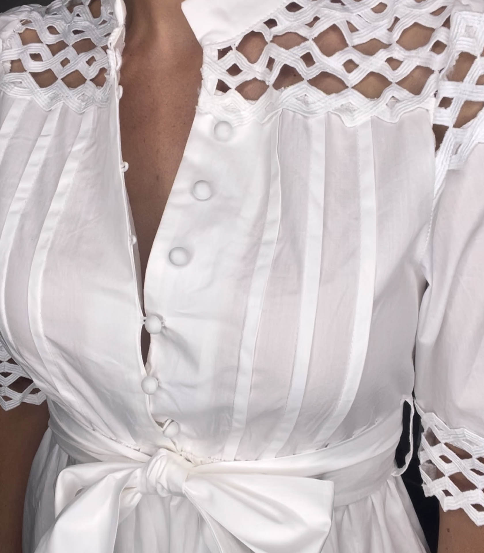 Vestido camisero. Cuello solapa y manga corta con detalles perforados. Tiene los mismos detalles perforados en la parte del pecho y la espalda. Detalles perforados en la falda. Elástico en cintura. Cinturón en mismo tejido ajustable con hebilla forrada. Forro interior del tono. Cierre frontal con botones.