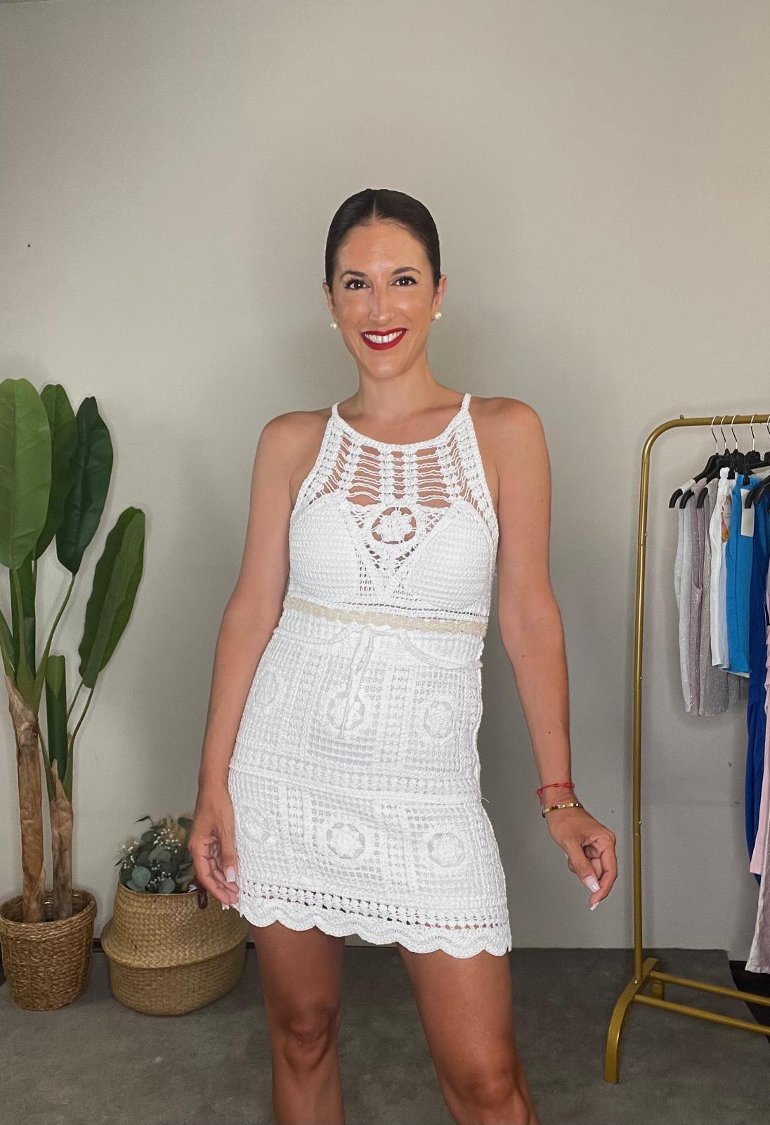 Vestido corto crochet. Tiene las copas incorporadas en la parte del pecho. Cintura con goma elástica en la parte trasera y espalda descubierta.