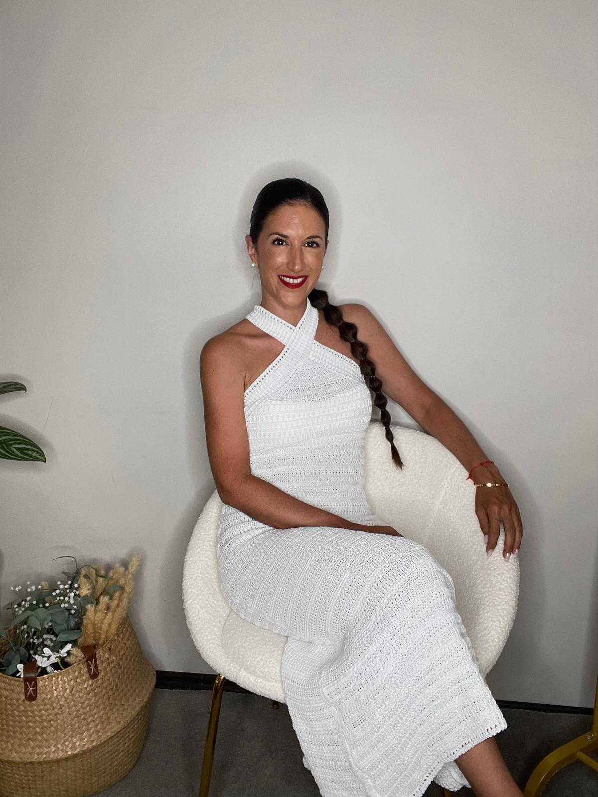 Vestido largo con escote cruzado. Detalle de tejido combinado en crochet. Parte trasera con el mismo escote que la parte delantera.