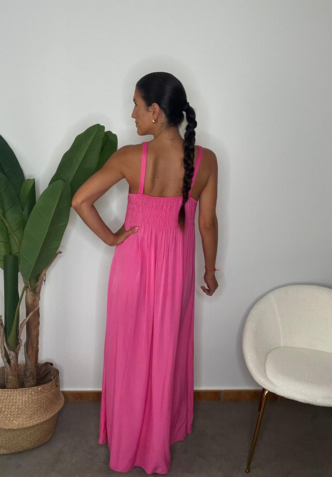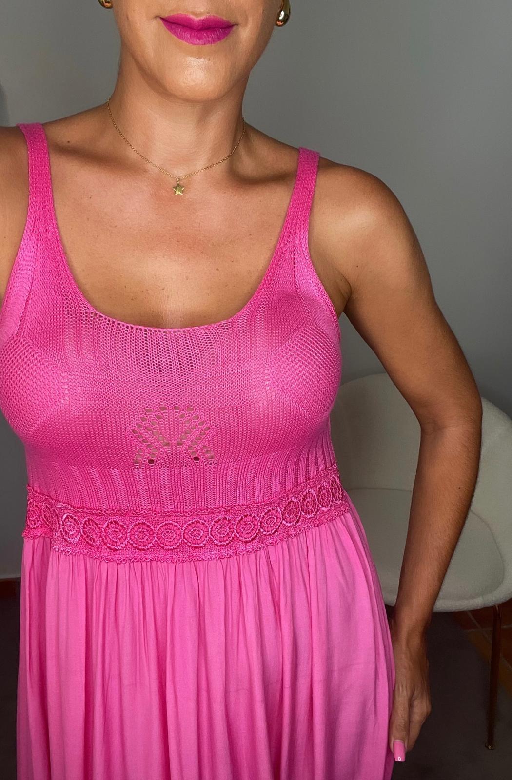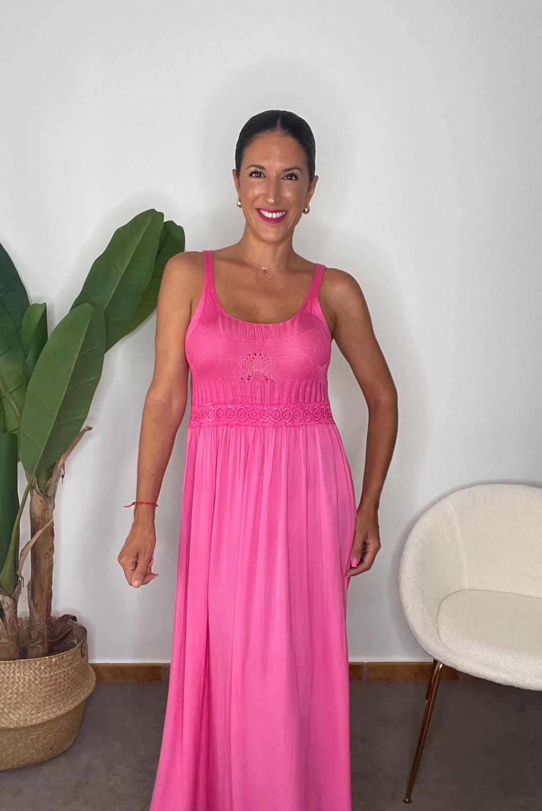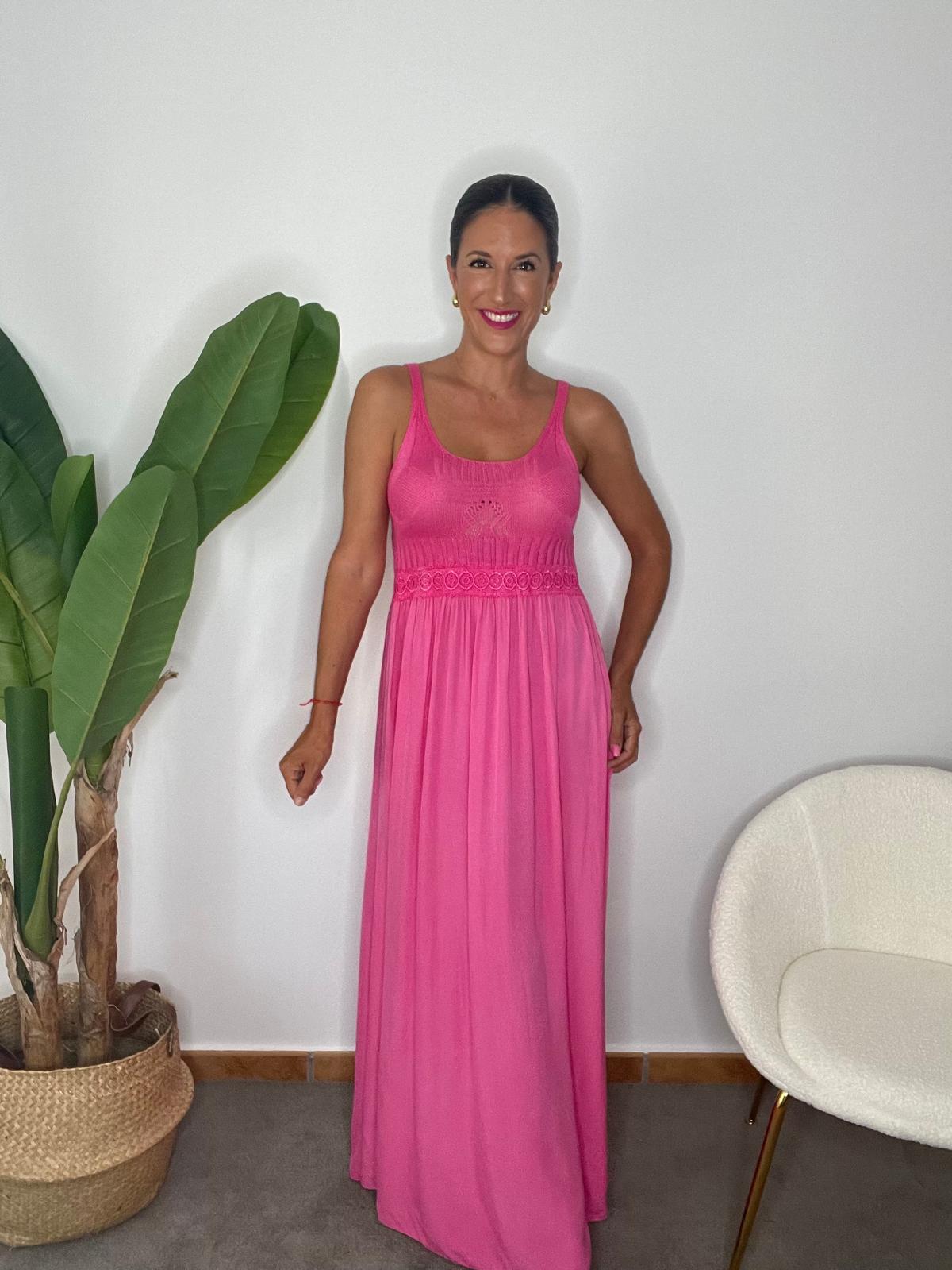 Vestido largo escote redondo y tirantes. Detalle de la parte del pecho en punto con cenefa de flores en la cintura. Parte trasera de la espalda con elástico.