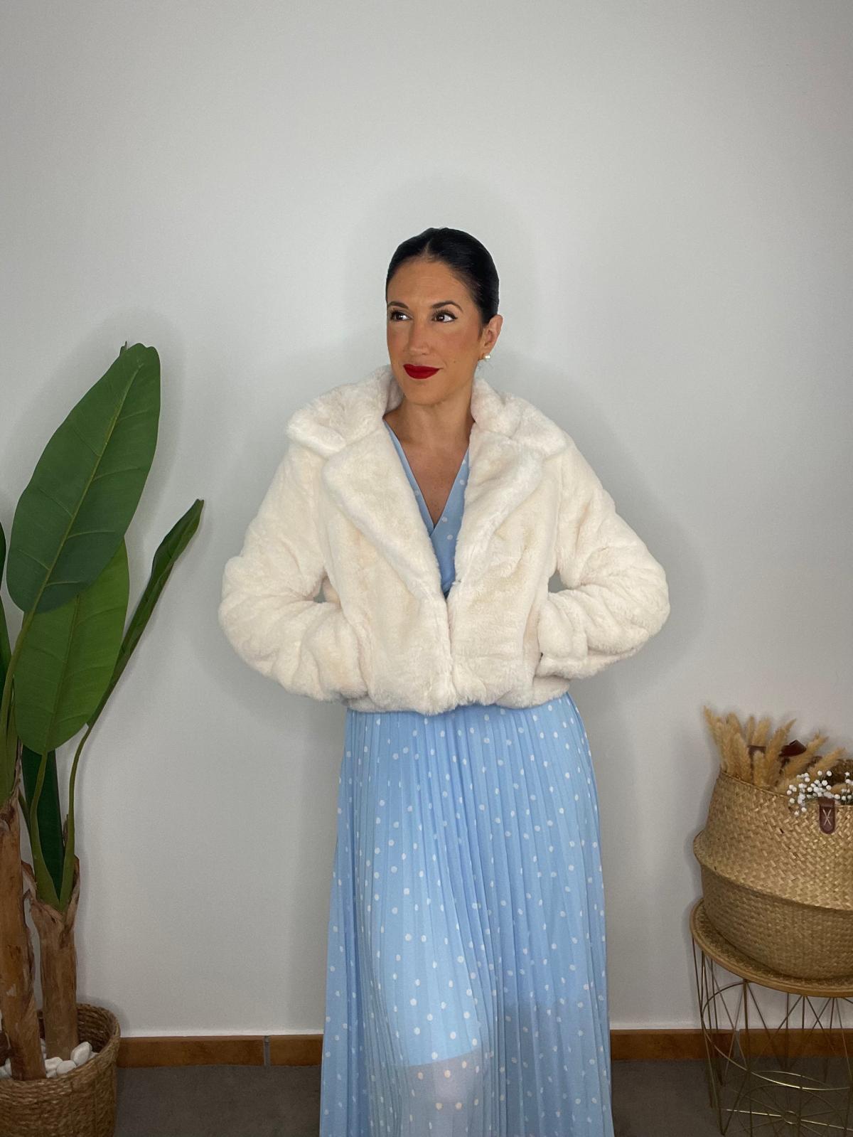 Vestido midi en tejido plisado. Escote en pico cruzado y manga con detalle acabado en volante. Cintura con goma elástica y cinturón con hebilla metálica. Forro interior.