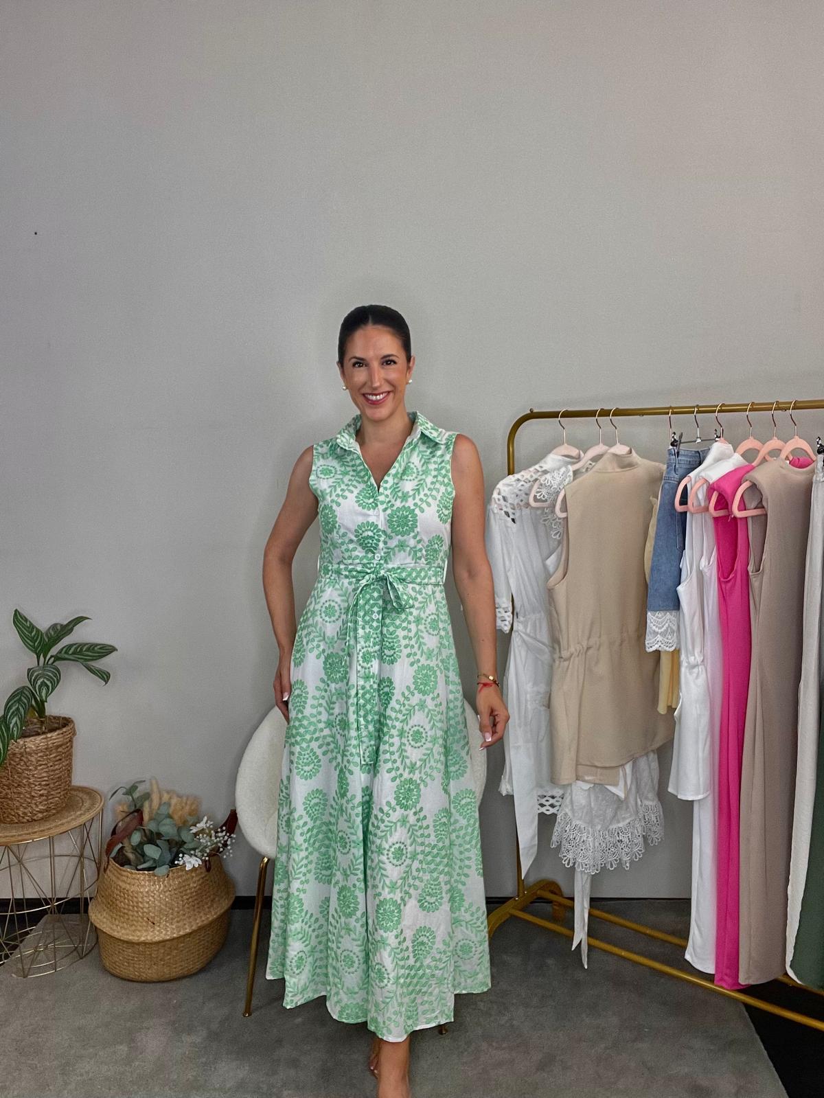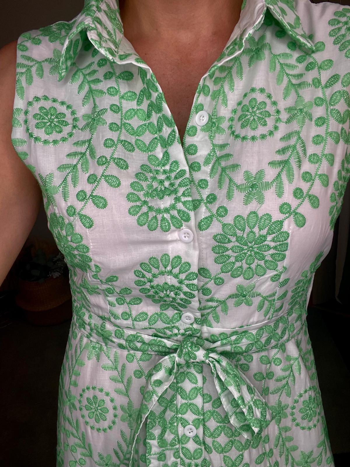 Vestido de escote camisero sin mangas. Detalle flores bordadas. Cierre con botones. Cinturón en mismo tejido ajustable con lazada.