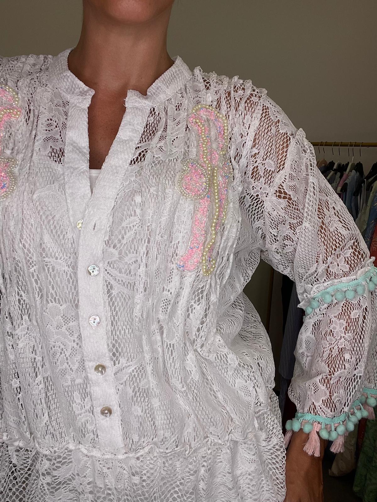 Vestido de encaje semitransparente. Detalle de lentejuelas y abalorios en la zona del pecho. Manga larga ancha acabada con borlas de hilo. Cierre frontal con botones. Bajo acabado con las mismas borlas de la manga. No incluye forro debajo.