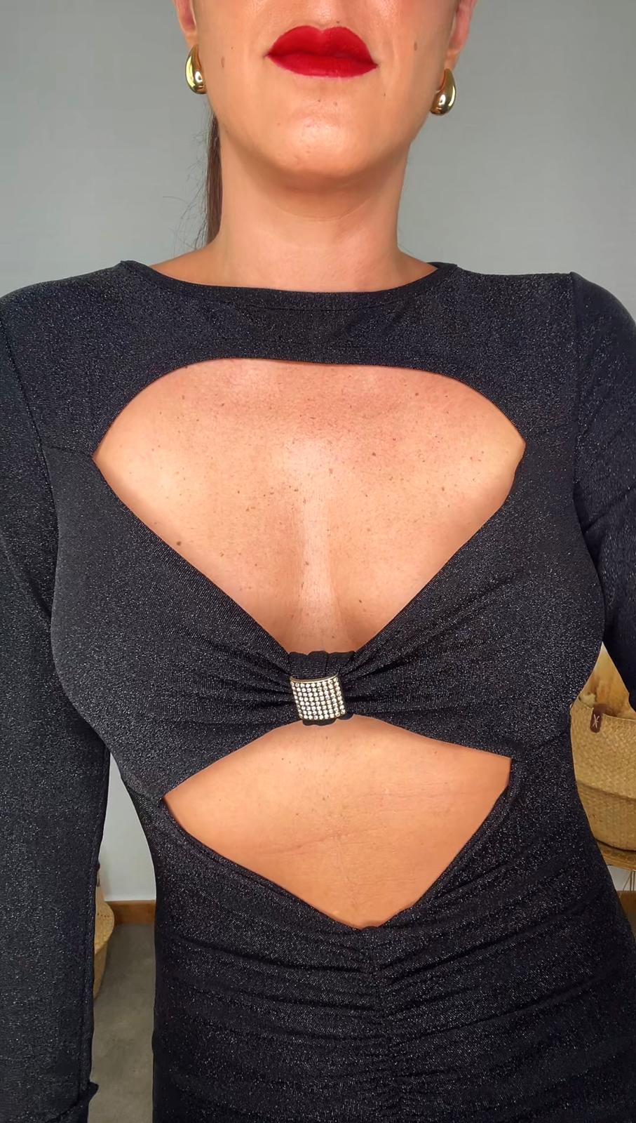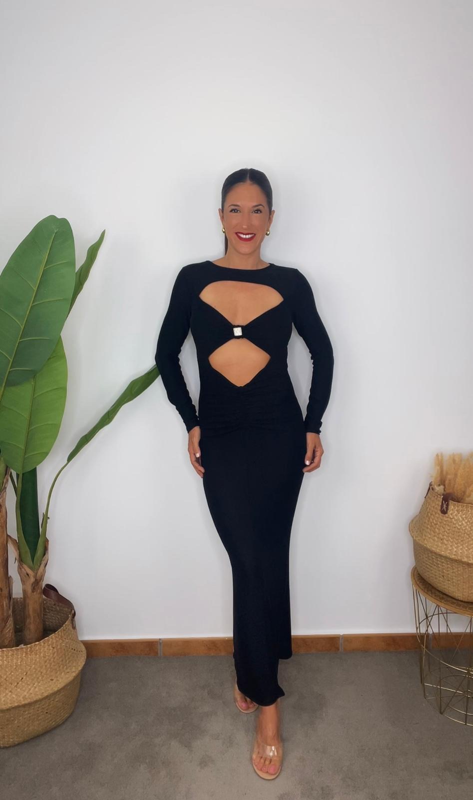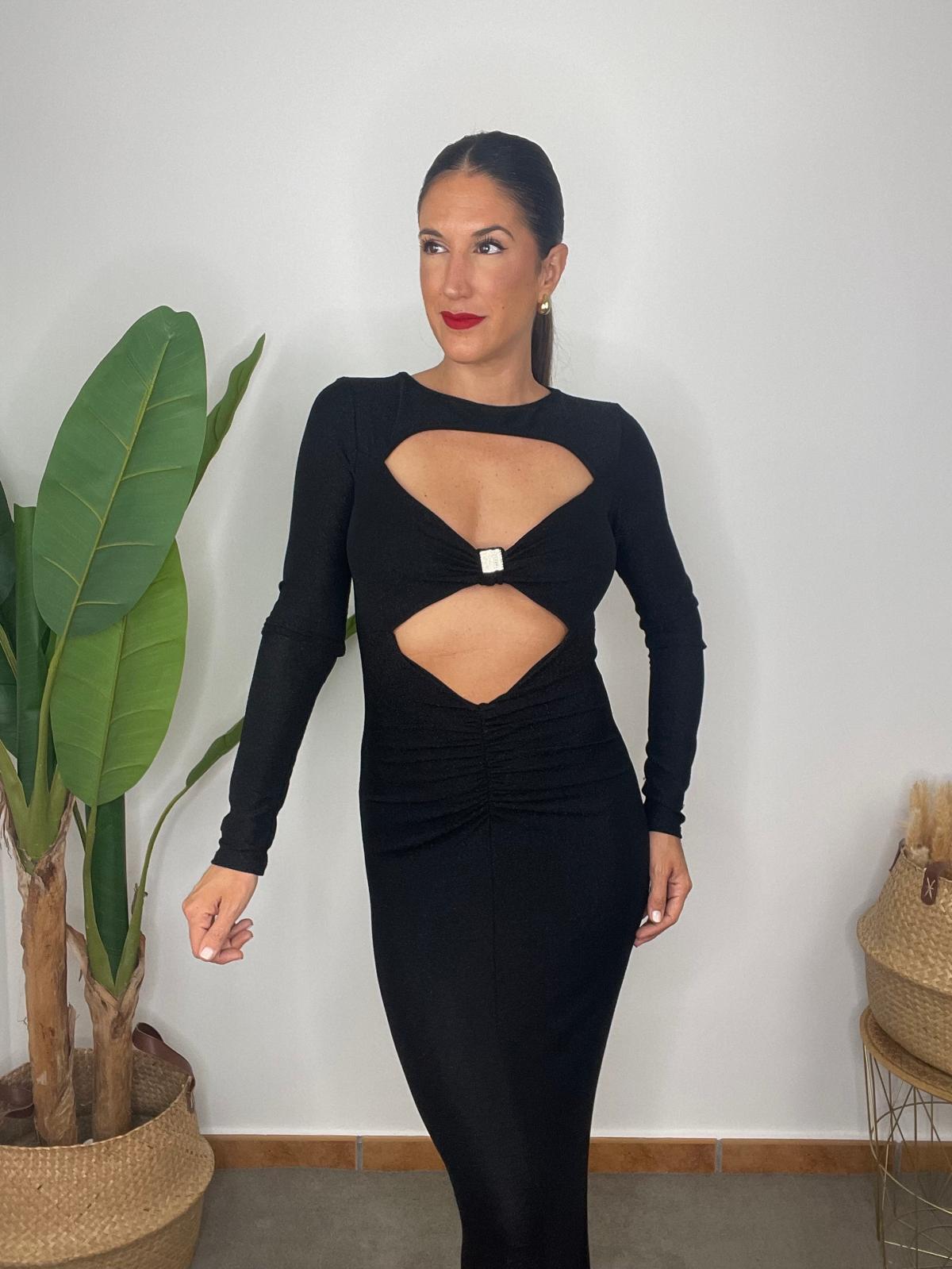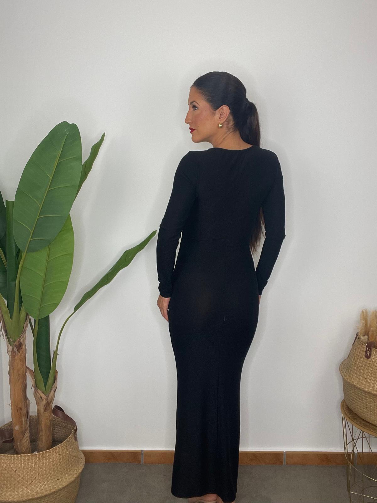 Vestido largo de escote redondo y manga larga. Tejido elástico de brillo. Detalle de pieza metálica con brillos en el escote. Abertura en la parte delantera y fruncido en la parte del abdomen. Parte trasera acabada en abertura en el bajo.