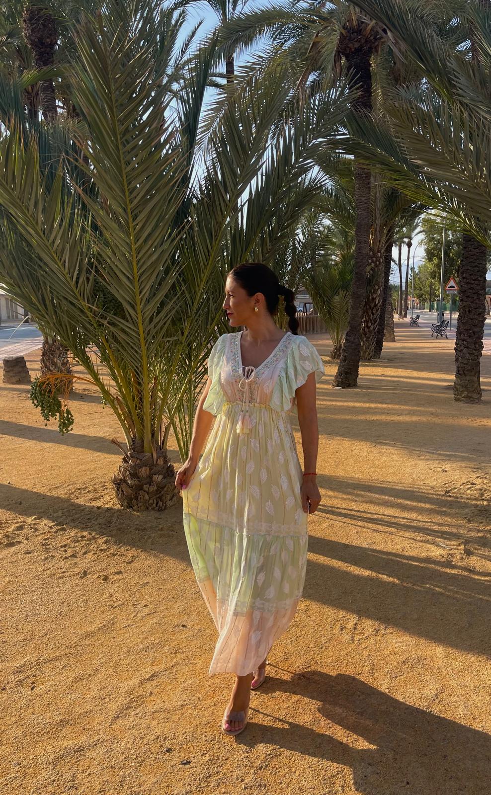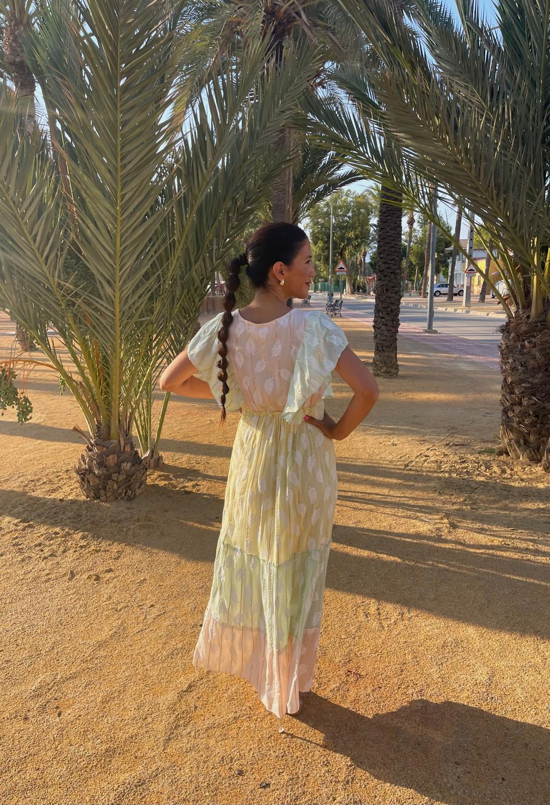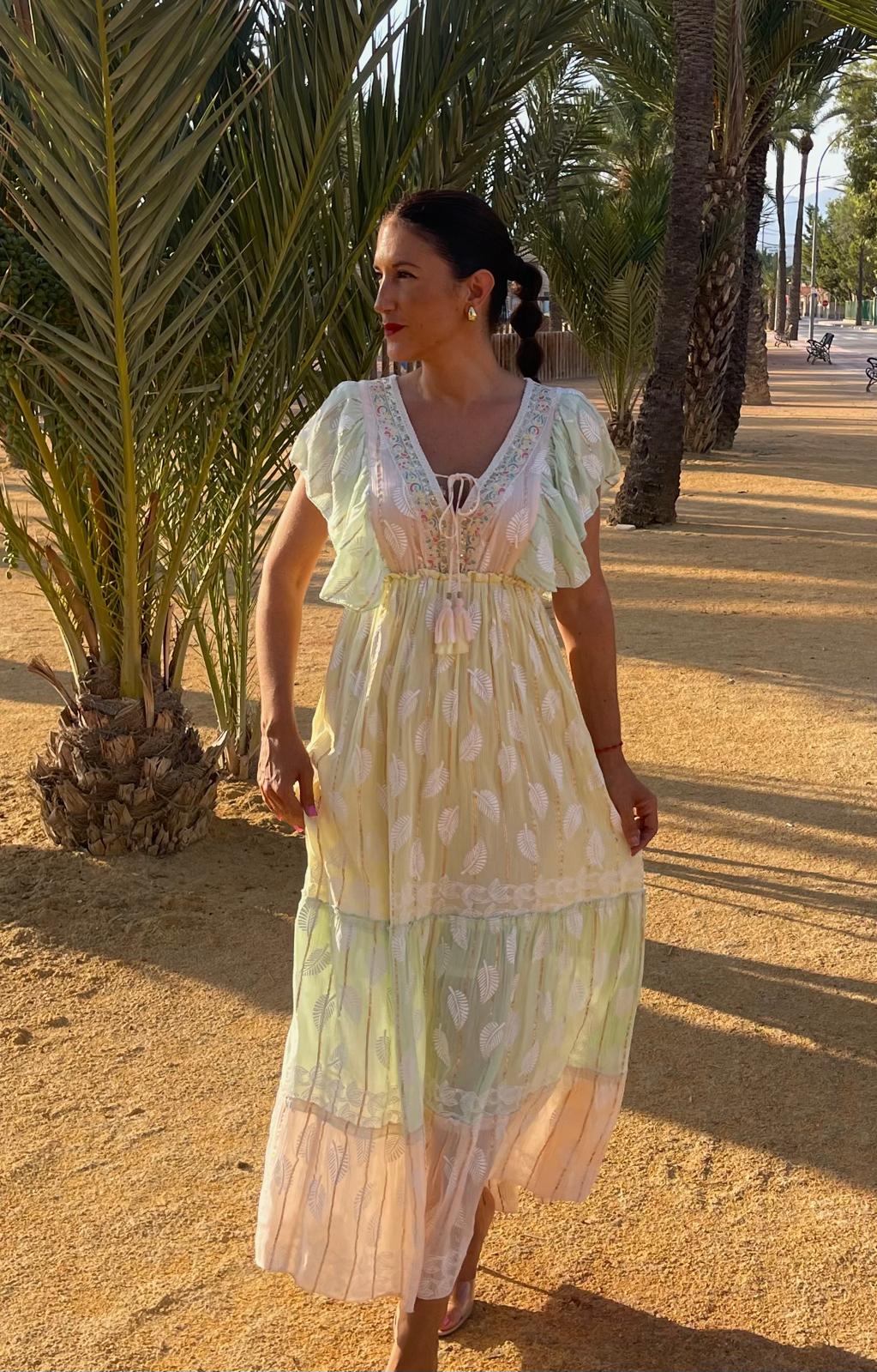 Vestido largo de escote en pico. Manga corta con volante. Detalle de bordados con lentejuelas en escote. Cintura con goma elástica. Espalda con escote en pico y lazos ajustables. Detalle de rayas doradas en el tejido del vestido. Forro interior.